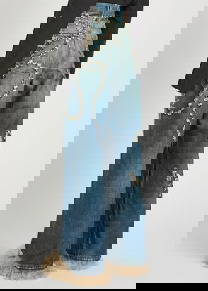 • Loose fit, mid-rise, wide leg, belt loops, five pockets, faded wash, all-over stain pattern