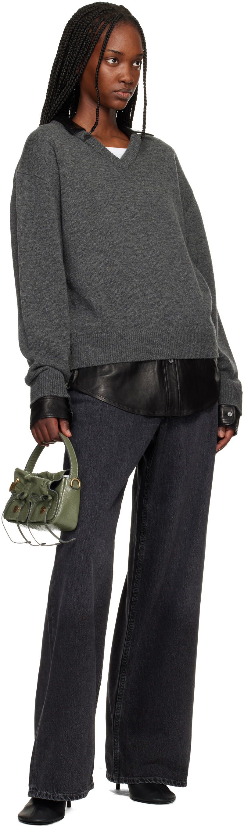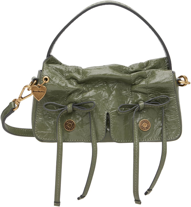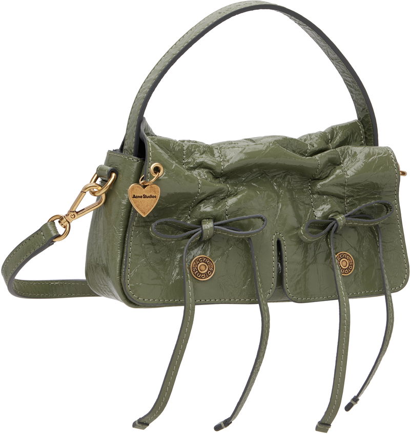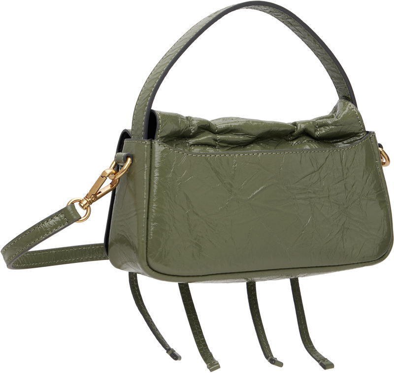 Crinkled patent goatskin top handle bag. LWG-certified goatskin. Logo embossed at carry handle. Detachable crossbody strap. Logo charm and drawstrings at face. Magnetic flap.