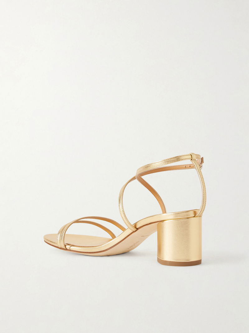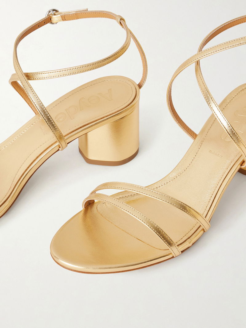 Defined by classic shapes and contemporary details, Aeyde's 'Mirella' sandals are crafted from smooth metallic leather in a strappy profile that cradles the foot. They have rounded toes, buckled ankle straps and solid circular heels for comfort.