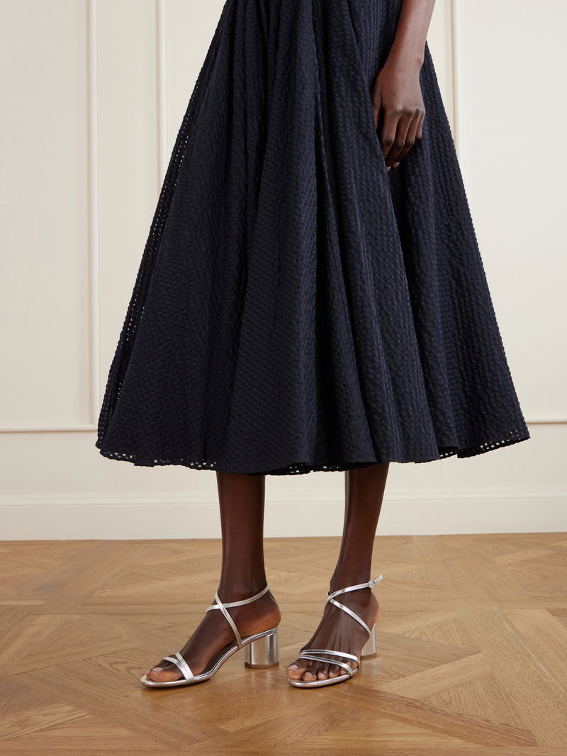 Aeyde's 'Mirella' sandals will bring a gorgeous shimmer to your occasionwear. Crafted from metallic leather, they have curved straps that frame the feet beautifully and are set on a comfortable block heel.