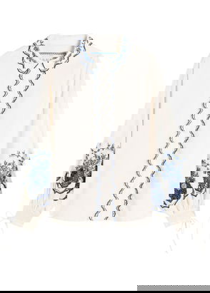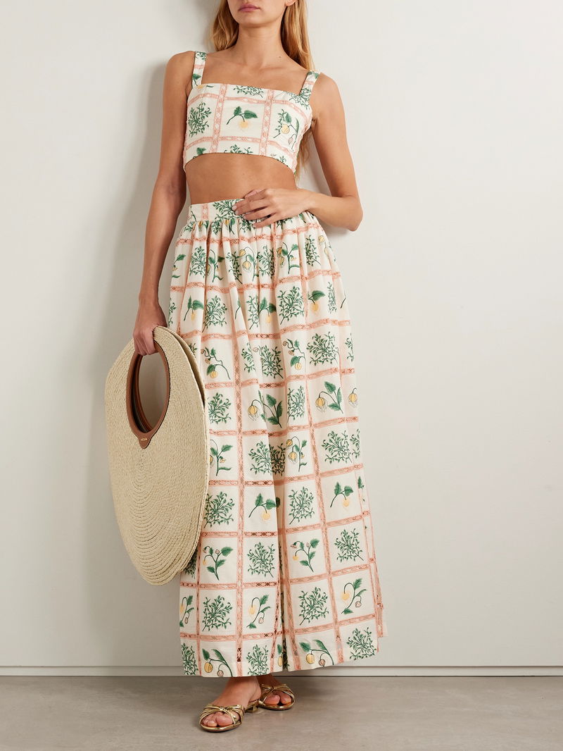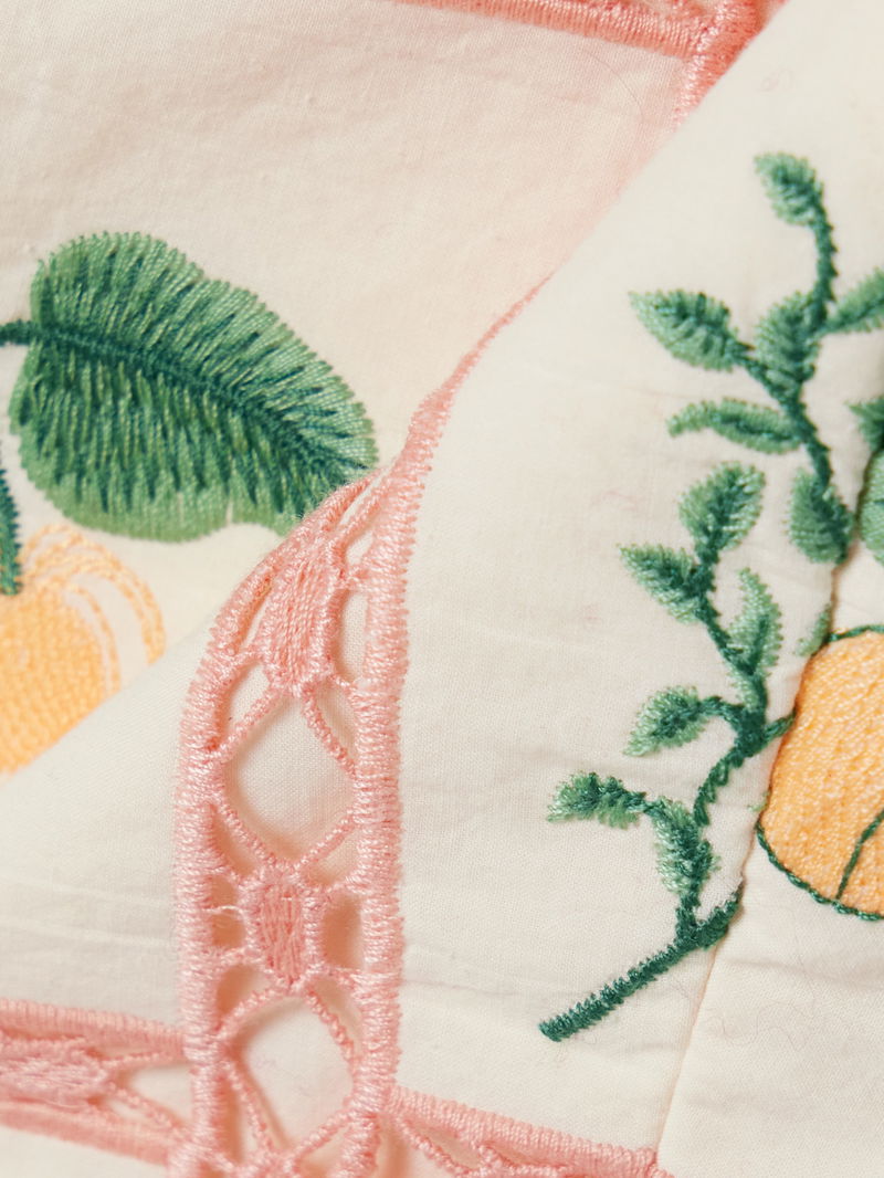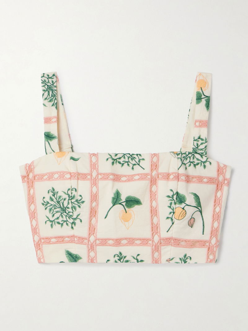 Agua by Agua Bendita's top is embroidered with flowering cacao trees between delicate crochet trims. It's cut from cotton and has a cropped shape.