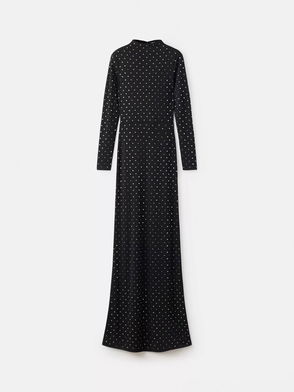 This V-neck dress features a tie-back detail and a drop waist seam that flows into a full skirt, beautifully embellished with a crystal flower design.