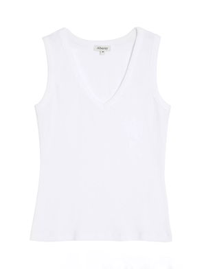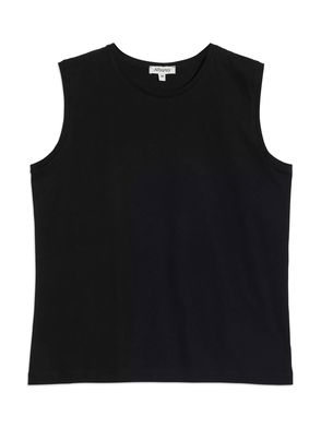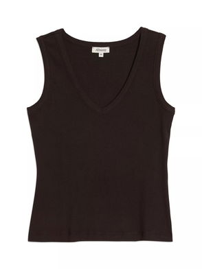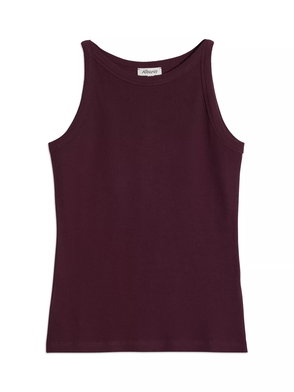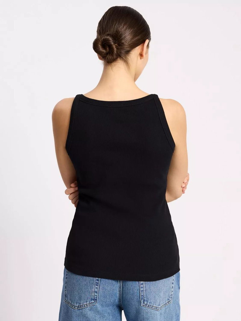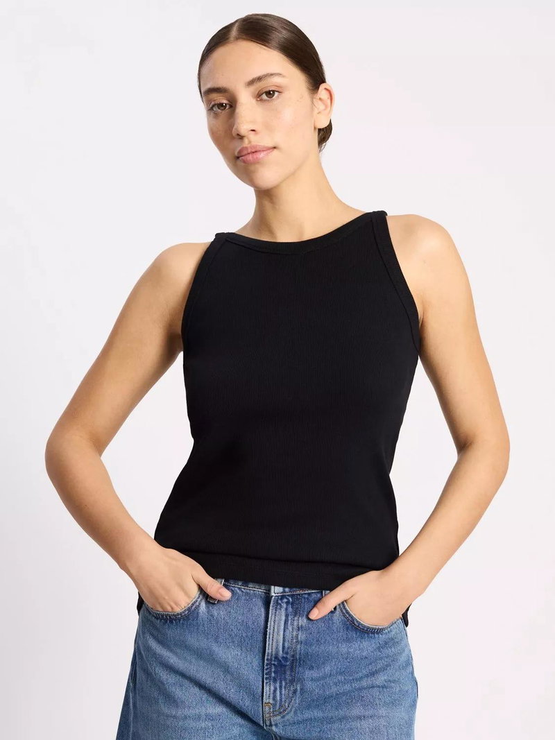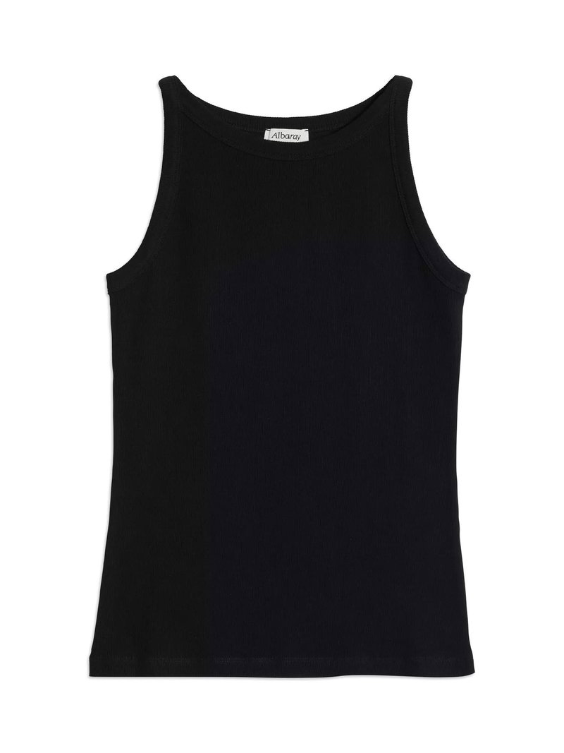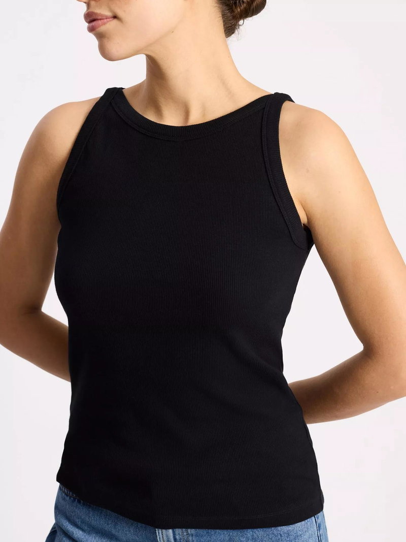A soft ribbed jersey vest designed with a flattering high neck and cut away shoulders.
