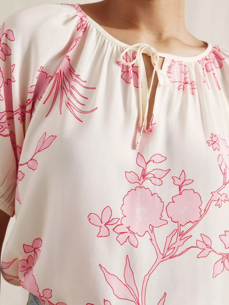 Featuring a notch neck with a tie front, and short sleeves with an elastic cuff, this top is perfect for any occasion and pairs beautifully with jeans. The kimono floral print adds a touch of elegance to your look. Update your wardrobe and make a statement with this versatile top.