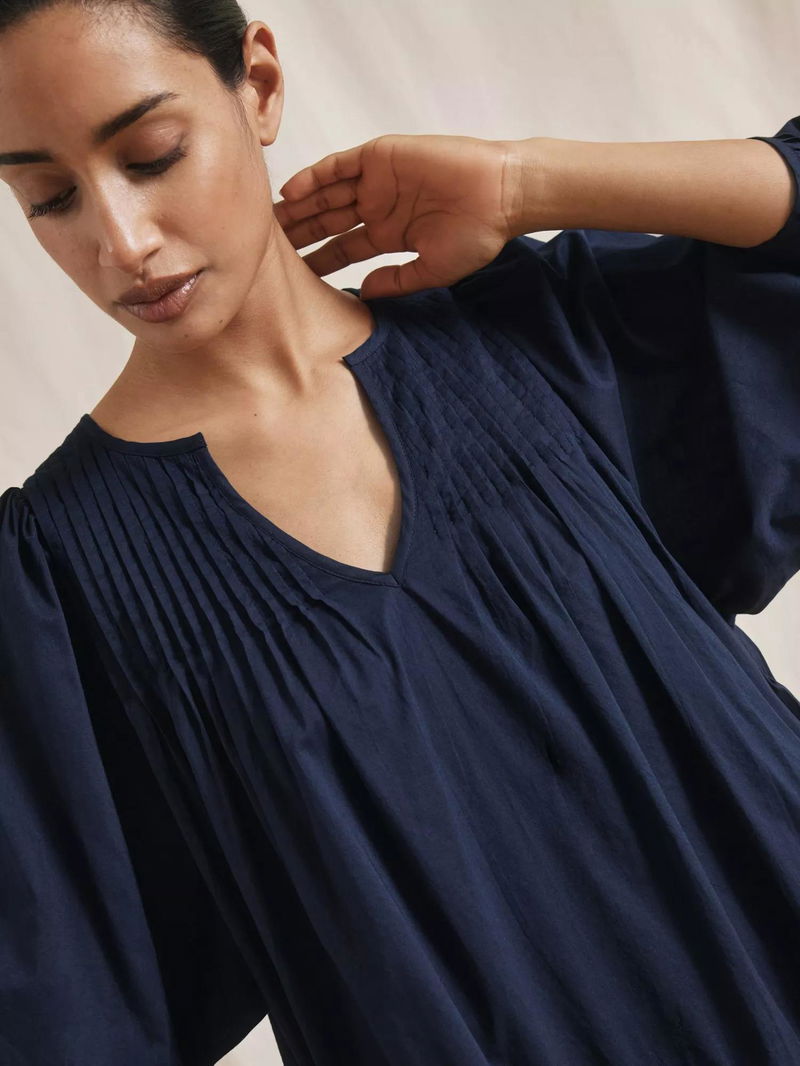 The perfect short summer dress. Featuring long sleeves with a gentle puff and pin-tuck detail at the cuff. The body is relaxed, cut with a pin tuck panel into a deep peplum hem for a relaxed fit. Crafted with a v-notch neck, to be styled with flats or kitten heels.