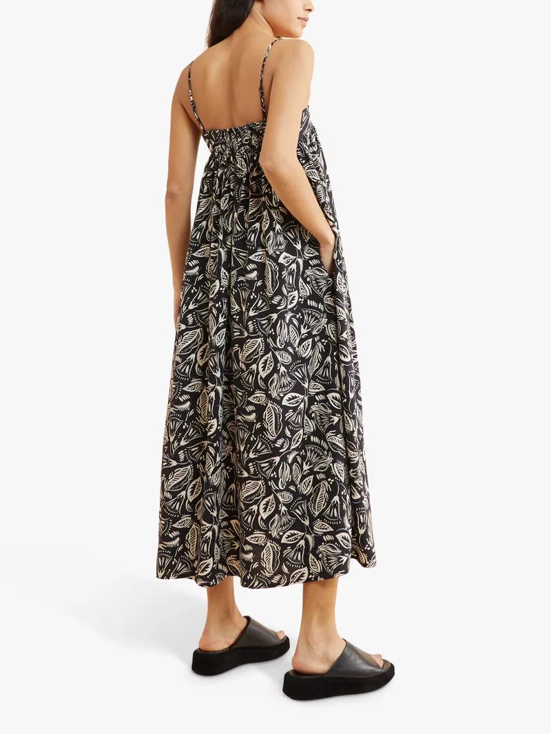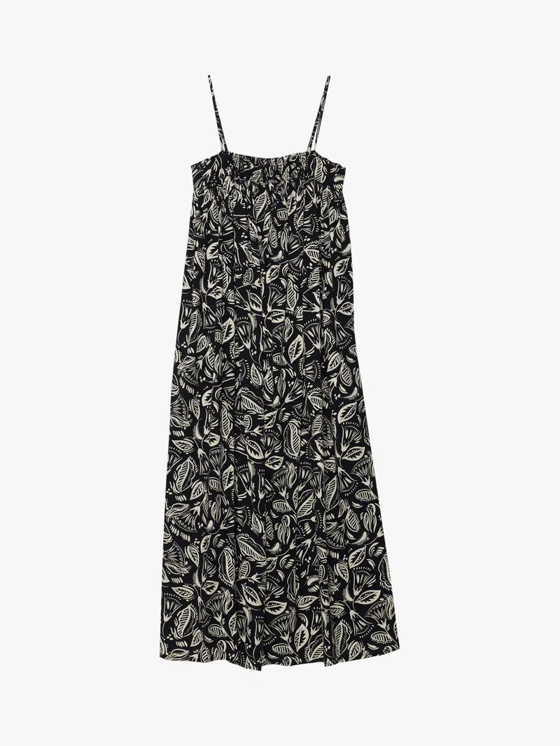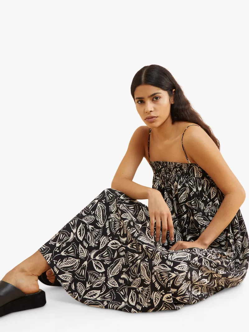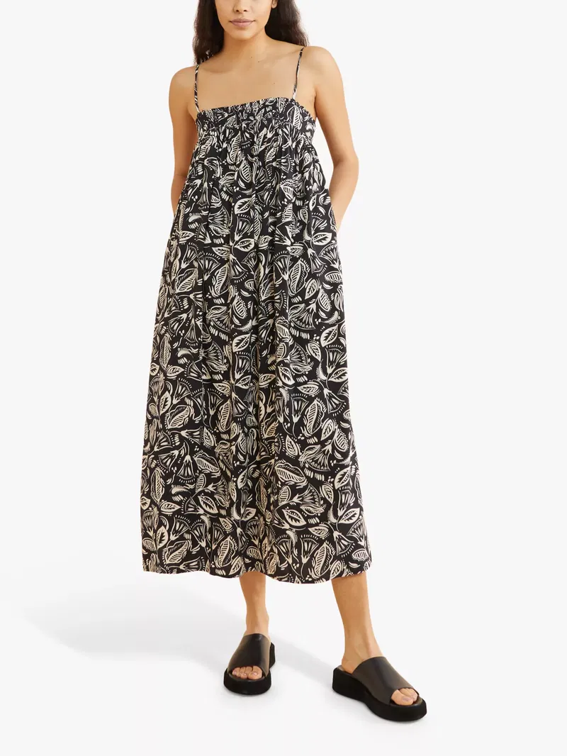 Boasting summer vibes, this midi dress by Albaray is printed with pretty florals and a shirred bodice for added charm. Framed with a dramatic bandeau neckline and sitting on the shoulders with adjustable spaghetti straps, this piece pulls on with sandals for summer days in the sun.
