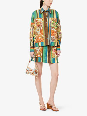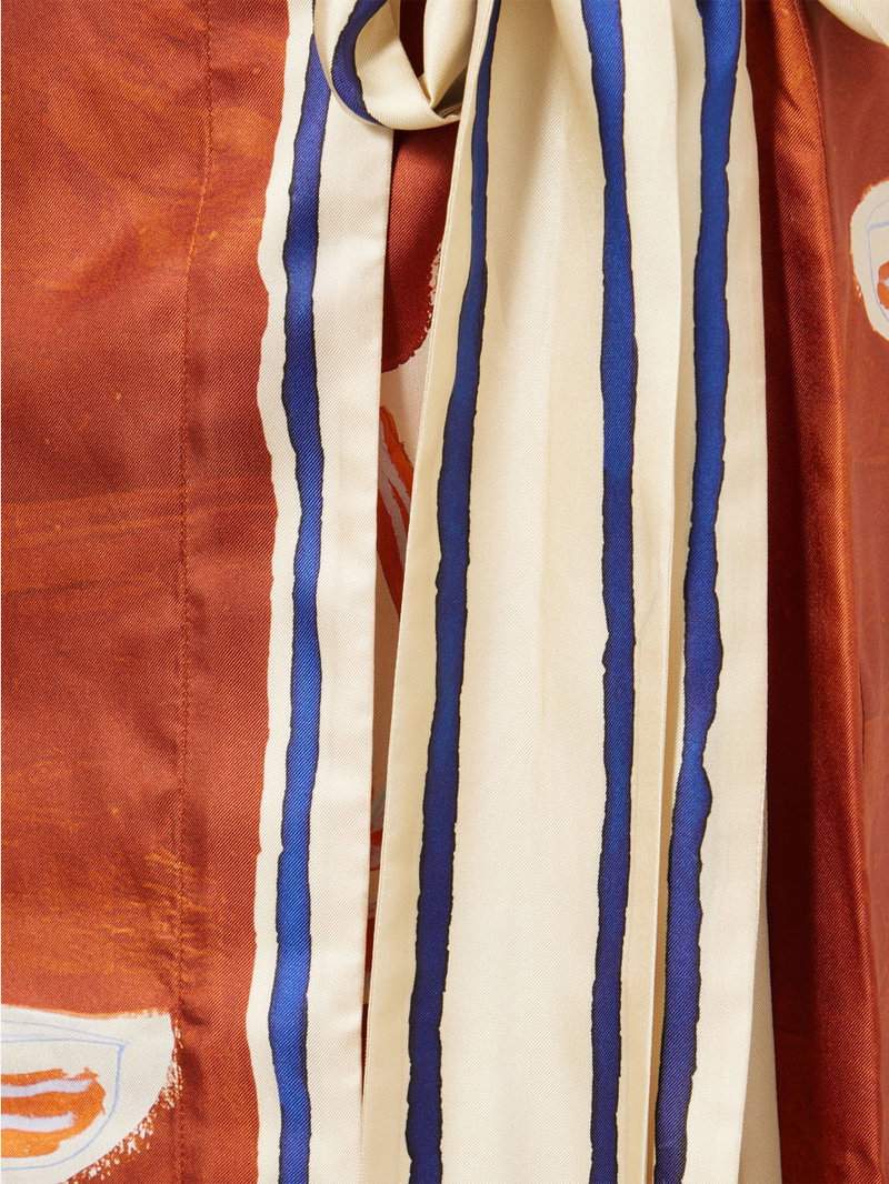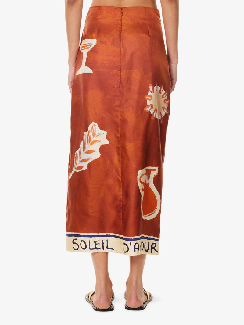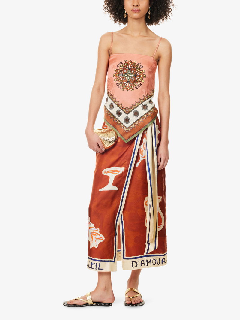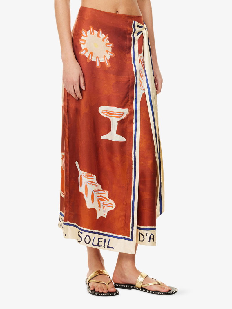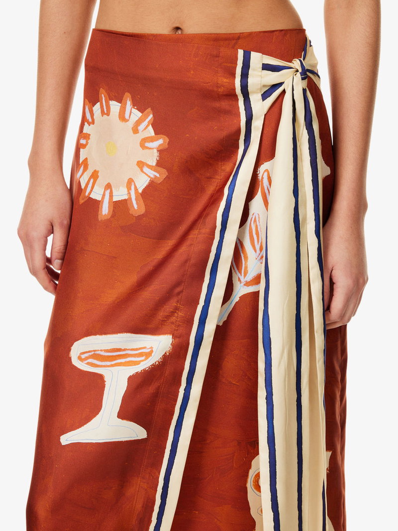Alémais x LRNCE silk sarong skirt. Concealed zip fastening at back. Relaxed fit, high-rise, side tie, wrap-design, contrasting border, midi length, all-over artwork print.