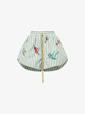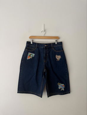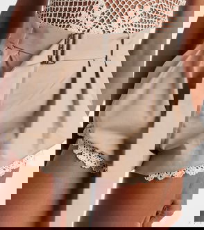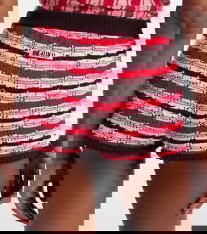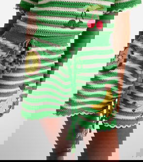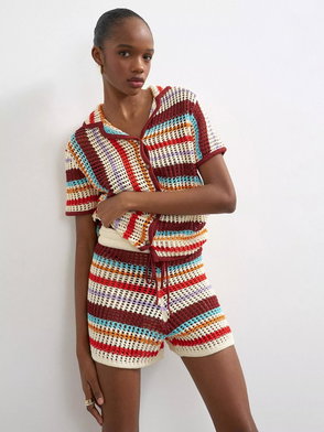 These shorts are crocheted from cotton with a striped motif and colorful patches.