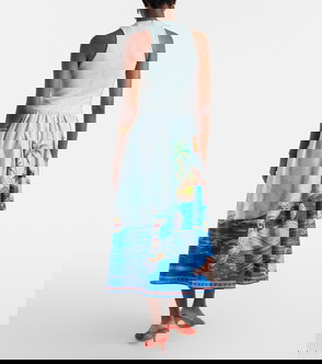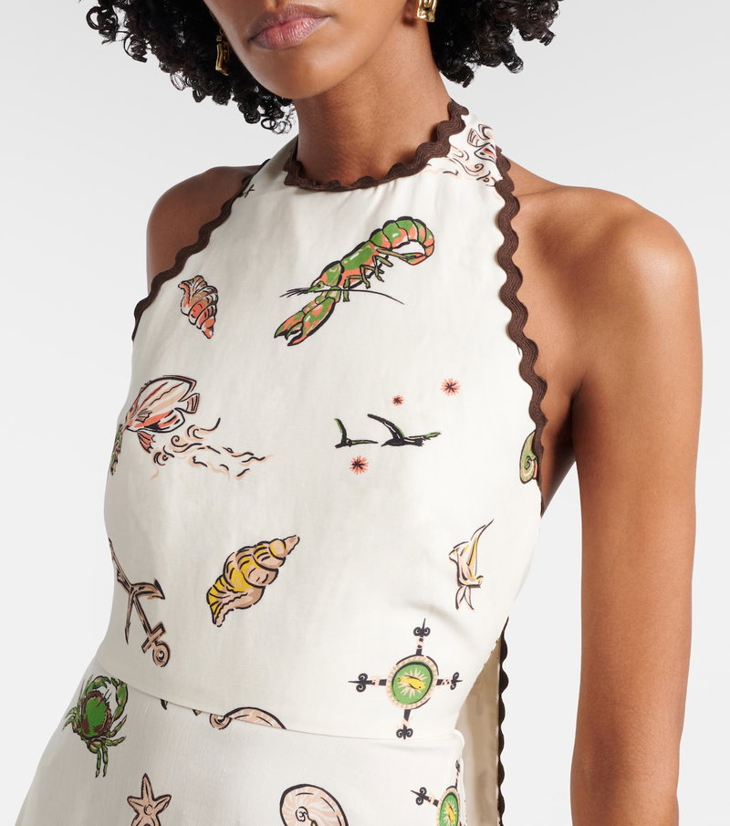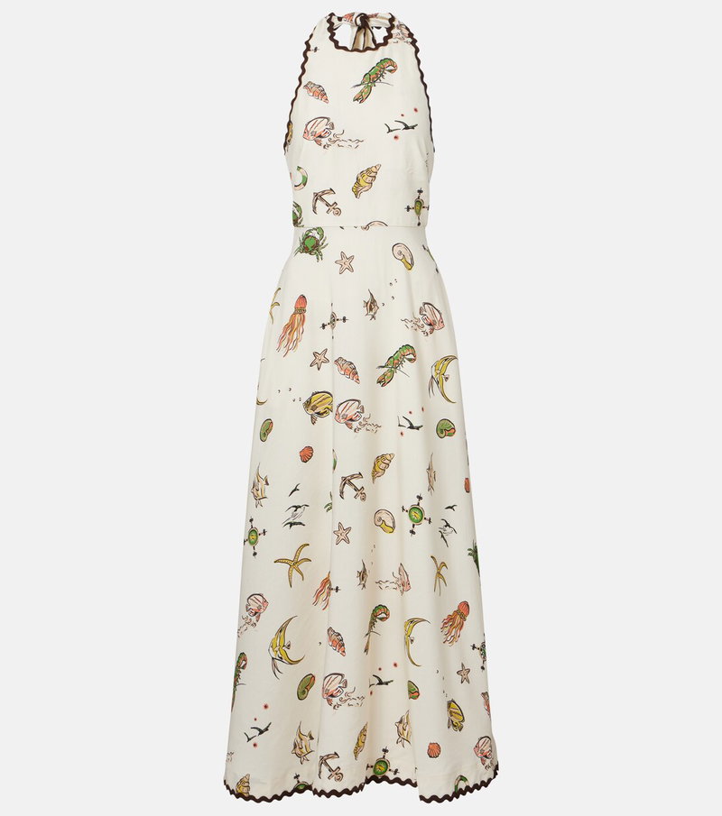 This midi dress features a flowing, halterneck silhouette with scalloped contrast trims and an all-over sea-inspired print.