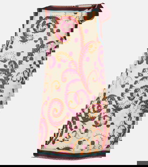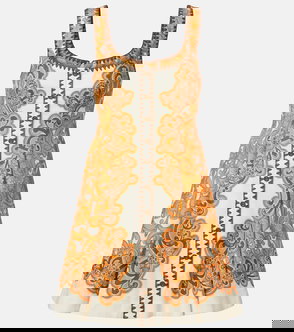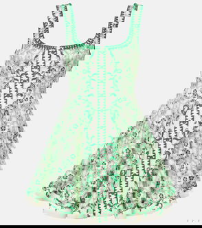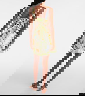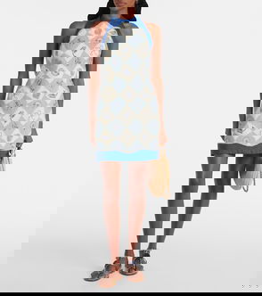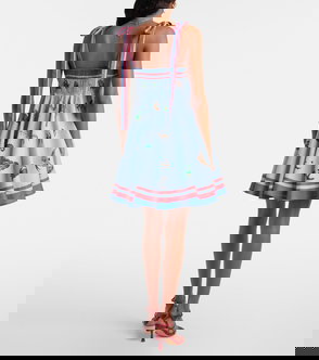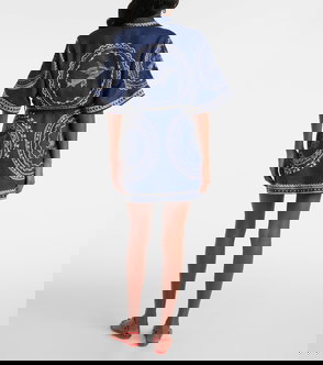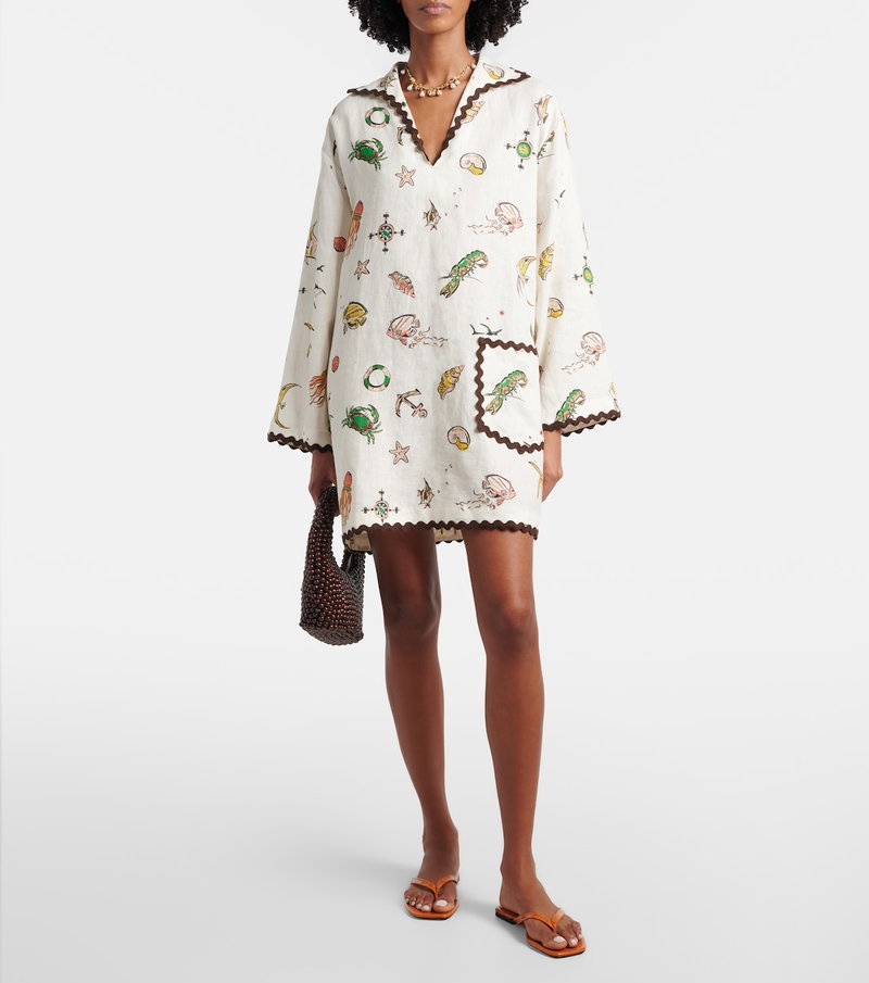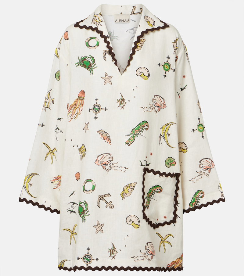 A contemporary brand with an artisanal focus, Alémais celebrates the art of fashion through an eclectic mix of patterns and prints. This shirt-inspired linen minidress features an open collar, flowing long sleeves, scalloped trims, and a charming all-over sea-inspired print.