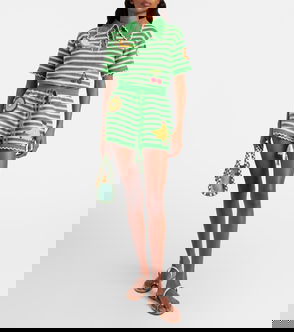 A contemporary brand with an artisanal focus, Alémais celebrates the art of fashion through an eclectic mix of patterns and prints. Crocheted from pure cotton, the Sundae bowling shirt features embroidered fruit motifs, scalloped trims, and a V-neckline.