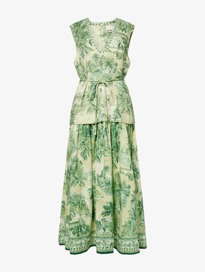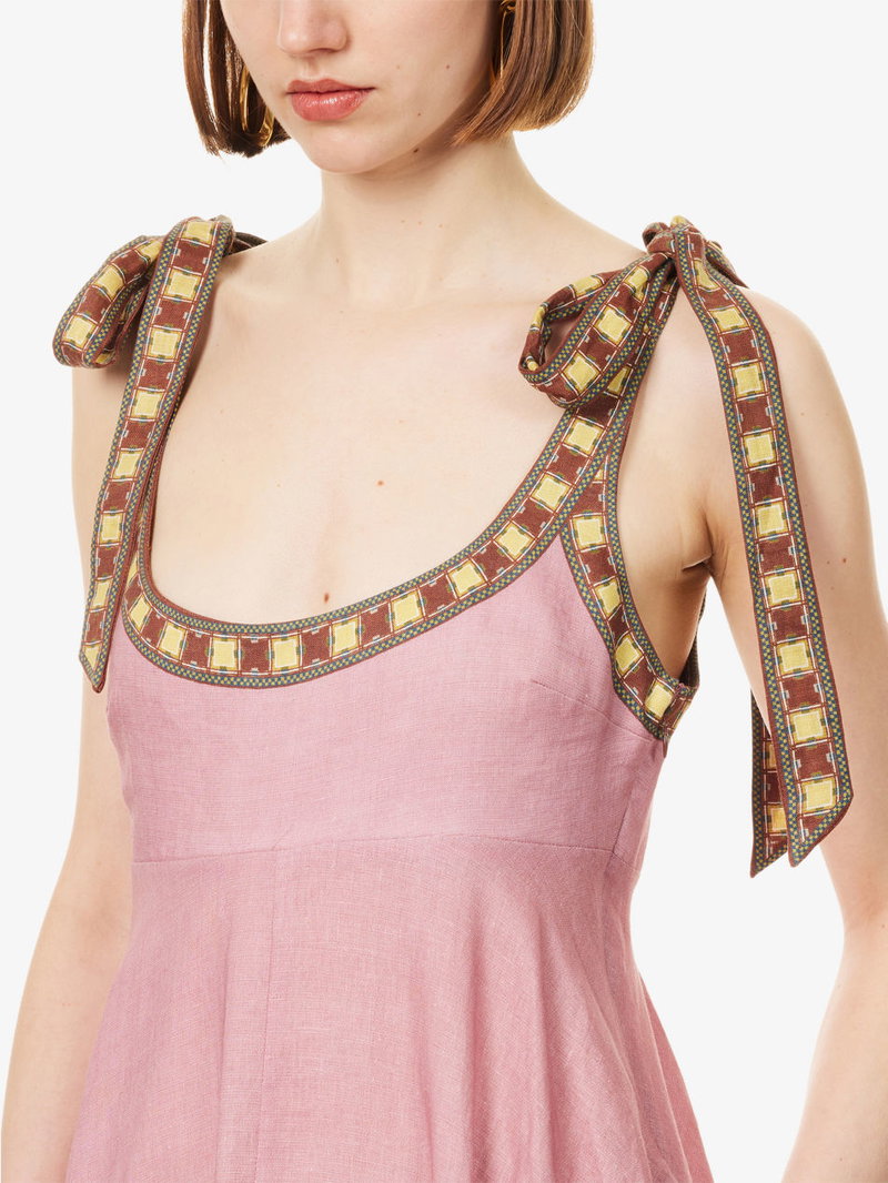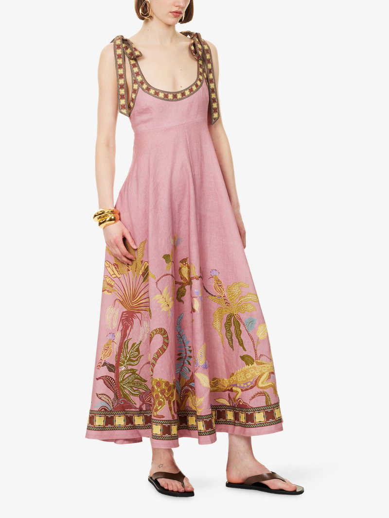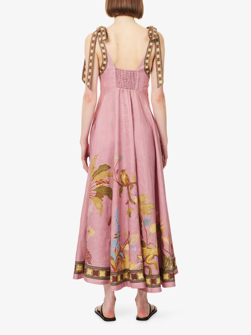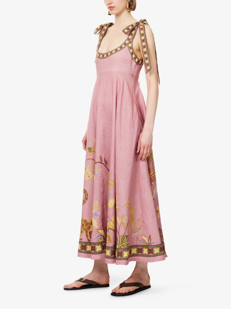 Alémais linen midi sundress. Zip fastening. Tied shoulder straps, straight hem, printed, flared skirt, fully lined.