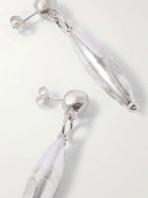 Pair of handcrafted drop earrings in recycled sterling silver.· Textured detailing throughout· Post-stud fastening·