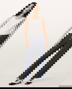Do jeans a little differently. The Aki Crossover Jeans are crafted from organic cotton to a straight wide-leg fit. They sit high-rise with a flattering crossover waistband. Show it off by pairing your new jeans with our staple Rina Tank and one of our iconic leather jackets.