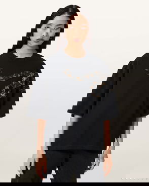 Looking for a versatile styling option? Then let us introduce you to the Amelie T-Shirt. Made from organic cotton, it's shaped to a classic crew-neck silhouette with dropped shoulders, creating a relaxed boxy fit. At the back there's a slight curved hem to add more dimension to the shape. Complete with new Anatomica artwork - it's so bold, so AllSaints.