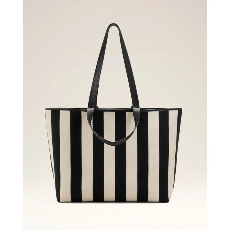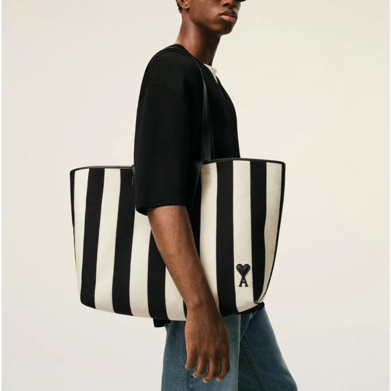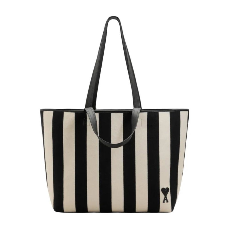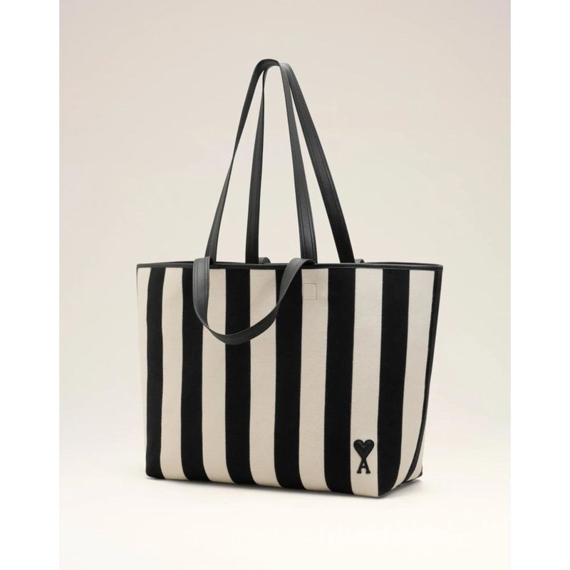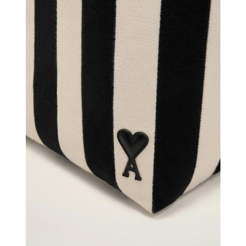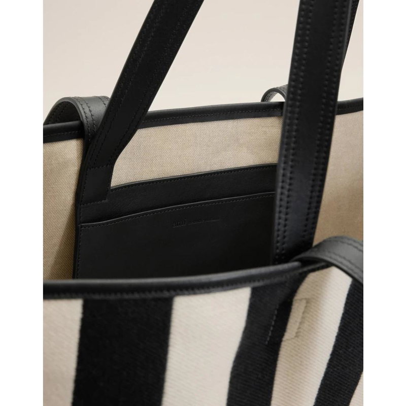 Ami Paris De Coeur Shopping Bag is a striped cotton canvas tote with smooth leather trim, designed for everyday carry. It offers a roomy central compartment and an internal leather pocket for organized storage.