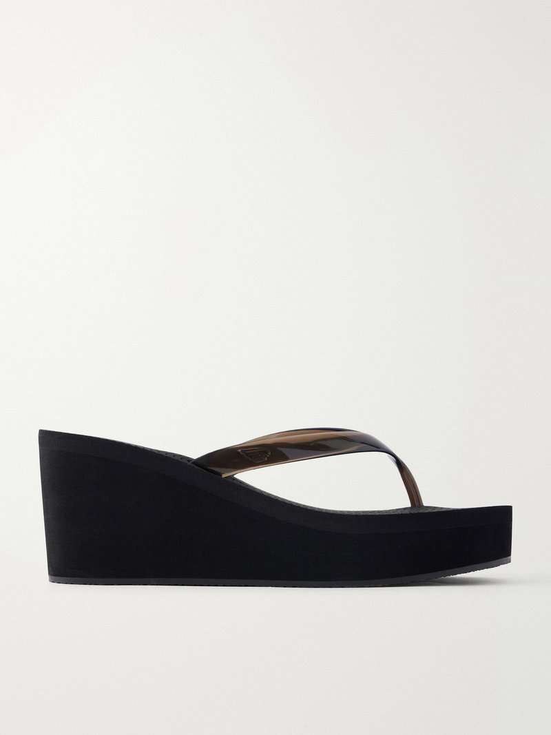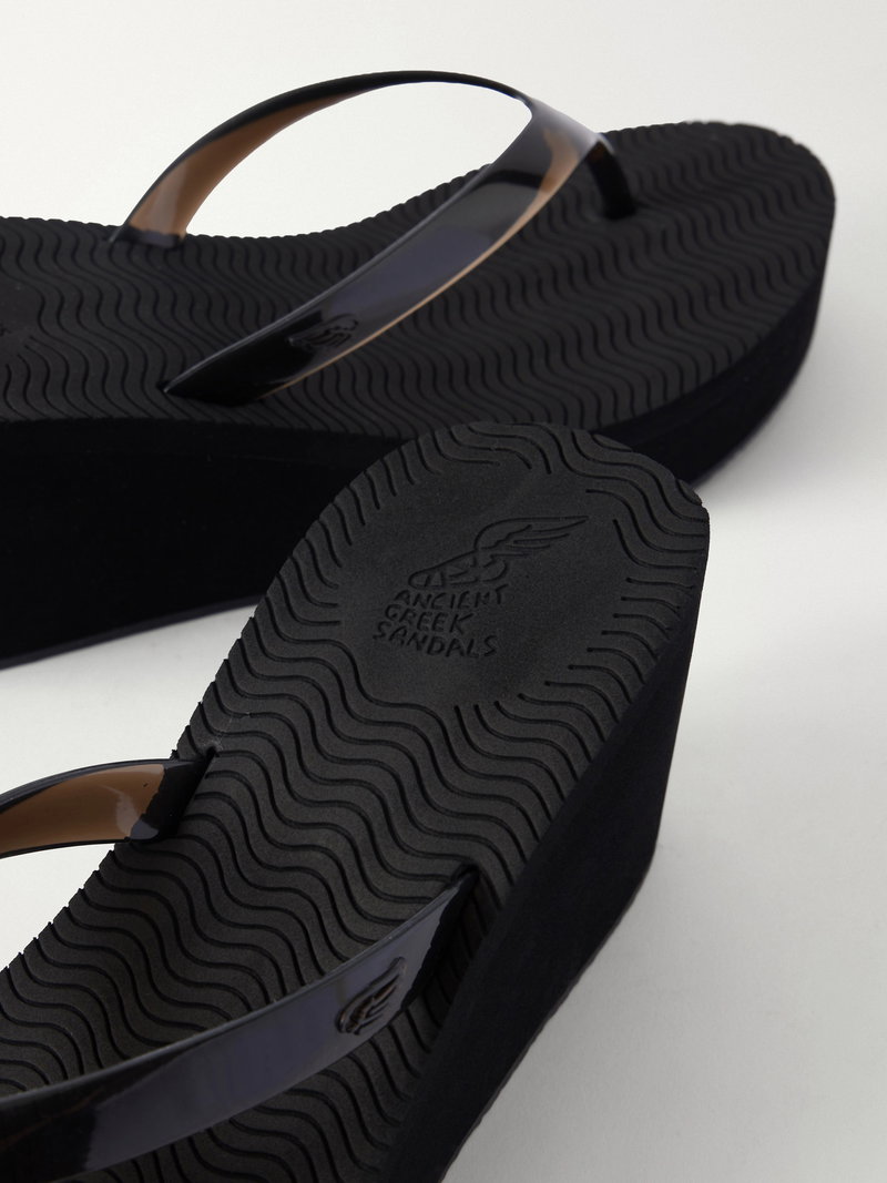 The wing logo embossed onto the straps of Ancient Greek Sandals' 'Etheria' flip flops nods to the label's love of Greek mythology. Inspired by '00s styles, they have glossy rubber thong straps and rest on comfortable wedge heels.