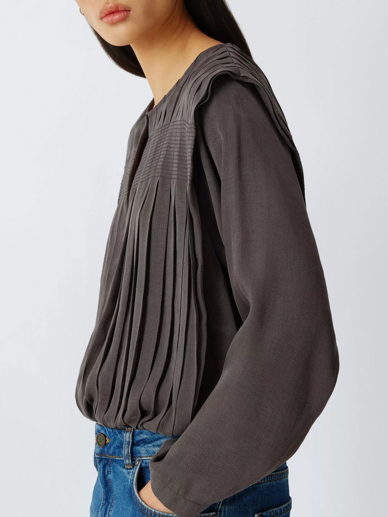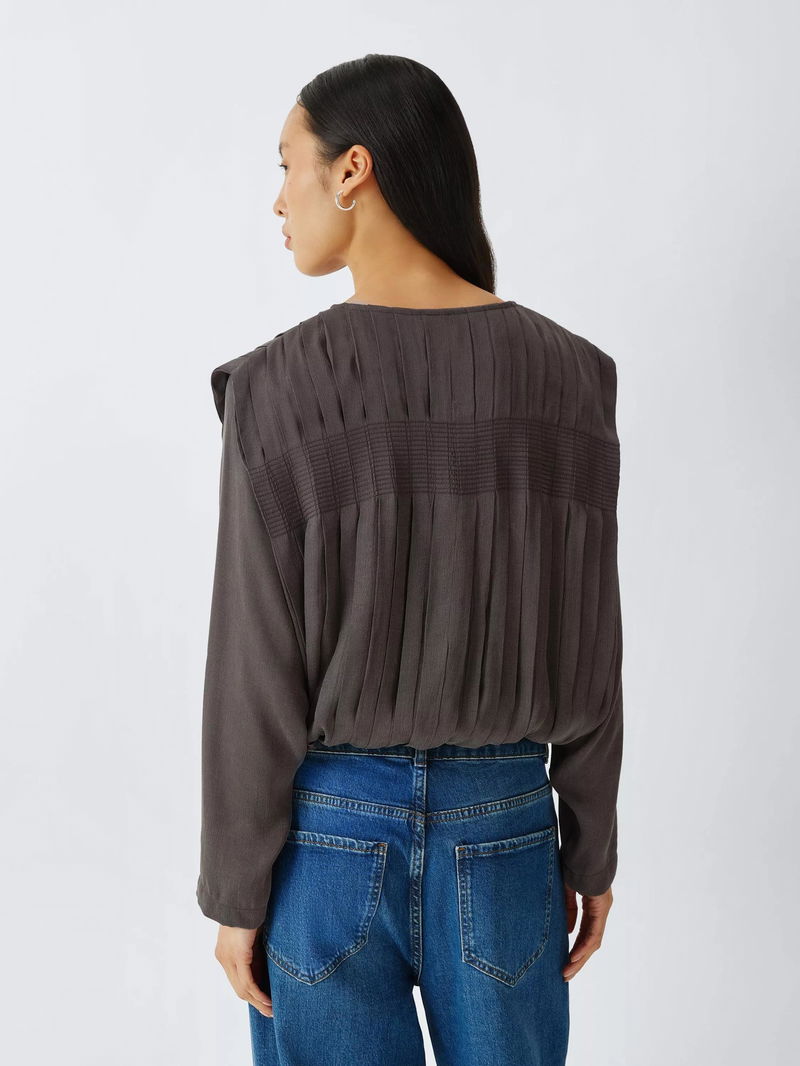 Pleat detail long sleeve top. Bubble hem. Lightweight fabric blend.