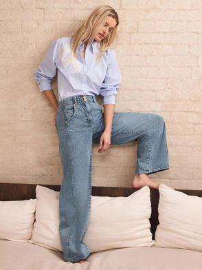 Wide leg jeans. Classic five pocket styling. Pure cotton denim.