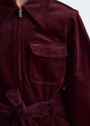 High-waist corduroy jumpsuit featuring a cropped silhouette secured with a self-tie belt.