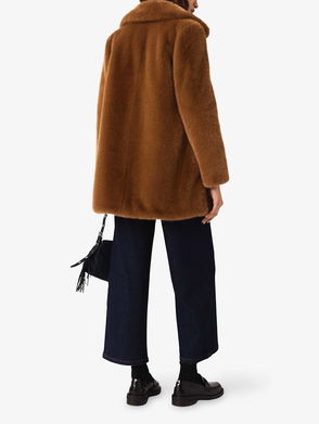 Long faux fur coat designed with leather trims, front hook and eye closures, slanted pockets, and an adjustable leather buckle belt.