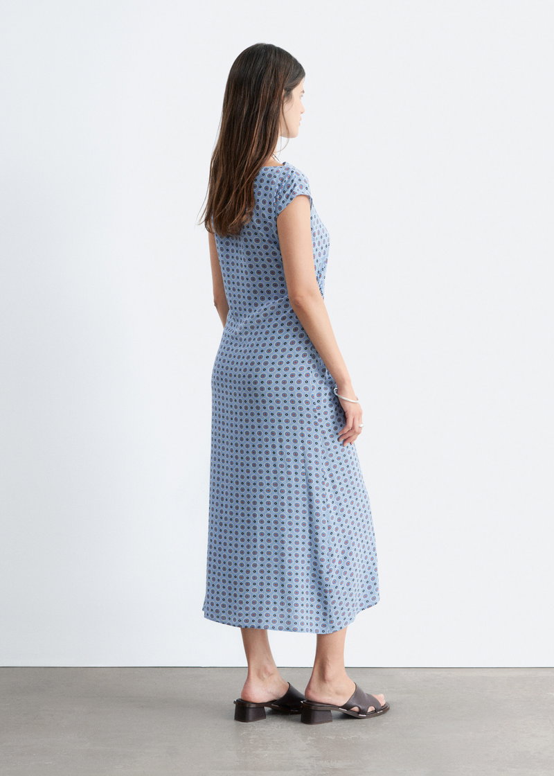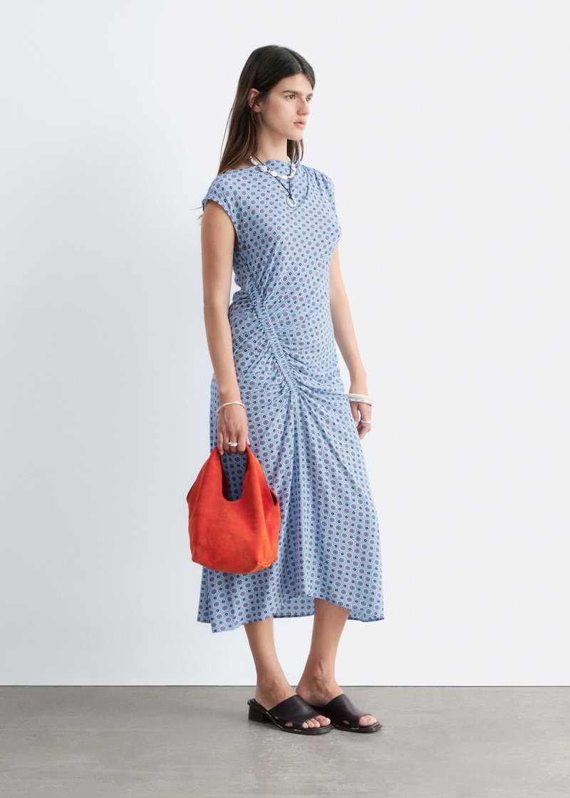 Cut from viscose with a fluid drape, this midi dress features a boat neckline and fixed gathers at one shoulder, with ruching at the opposite side, creating a silhouette that falls to an asymmetric hem.