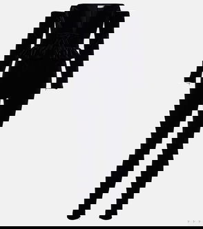 Bandeau jumpsuit with bow detail and barrel legs. Straps are removable and adjustable. Side pockets, back welt pockets. Zipper at back.