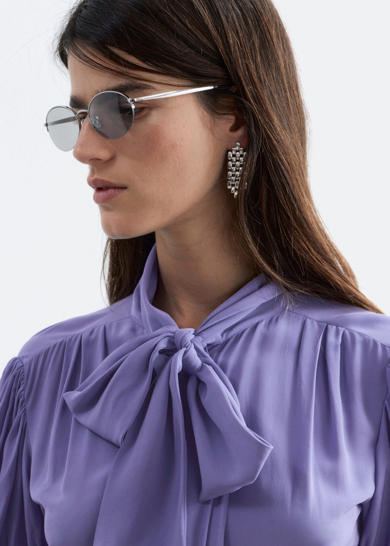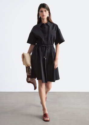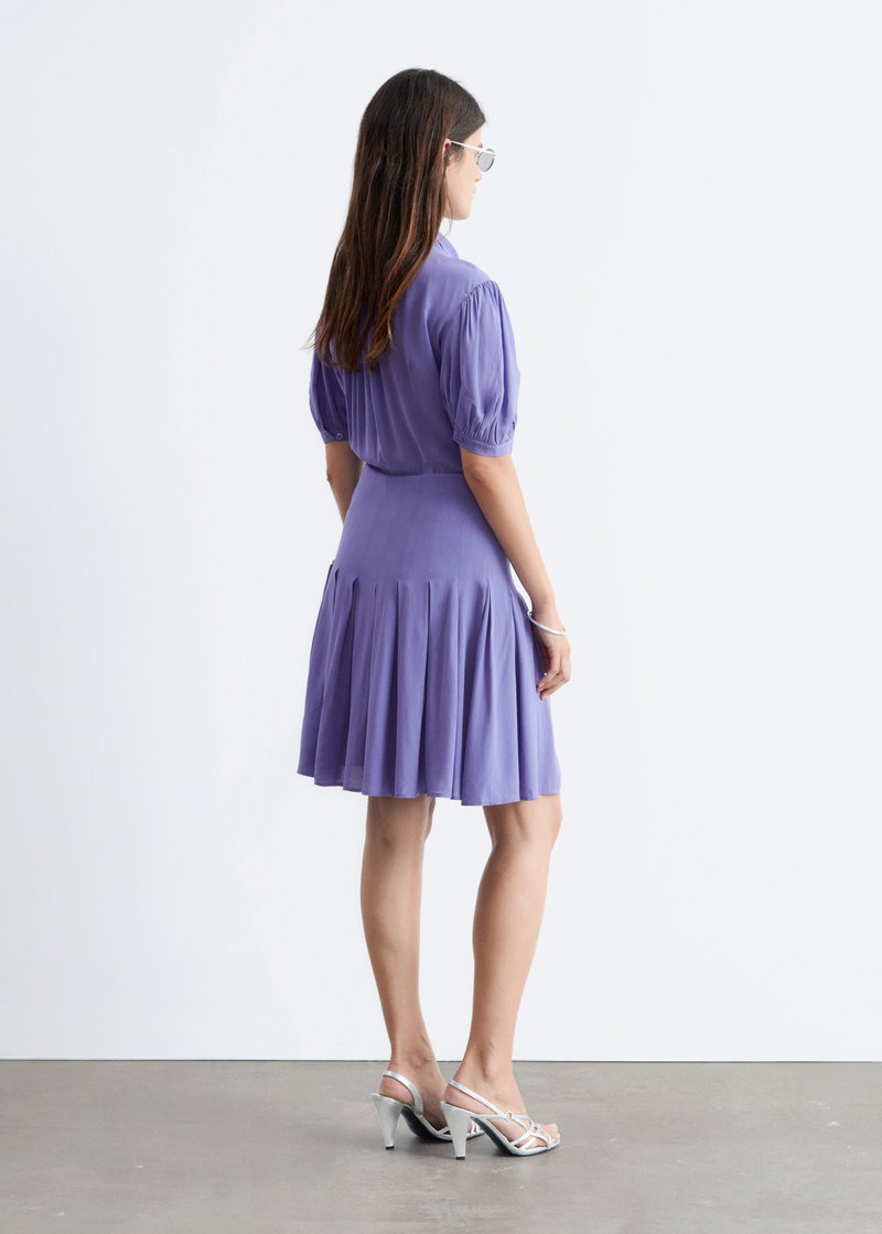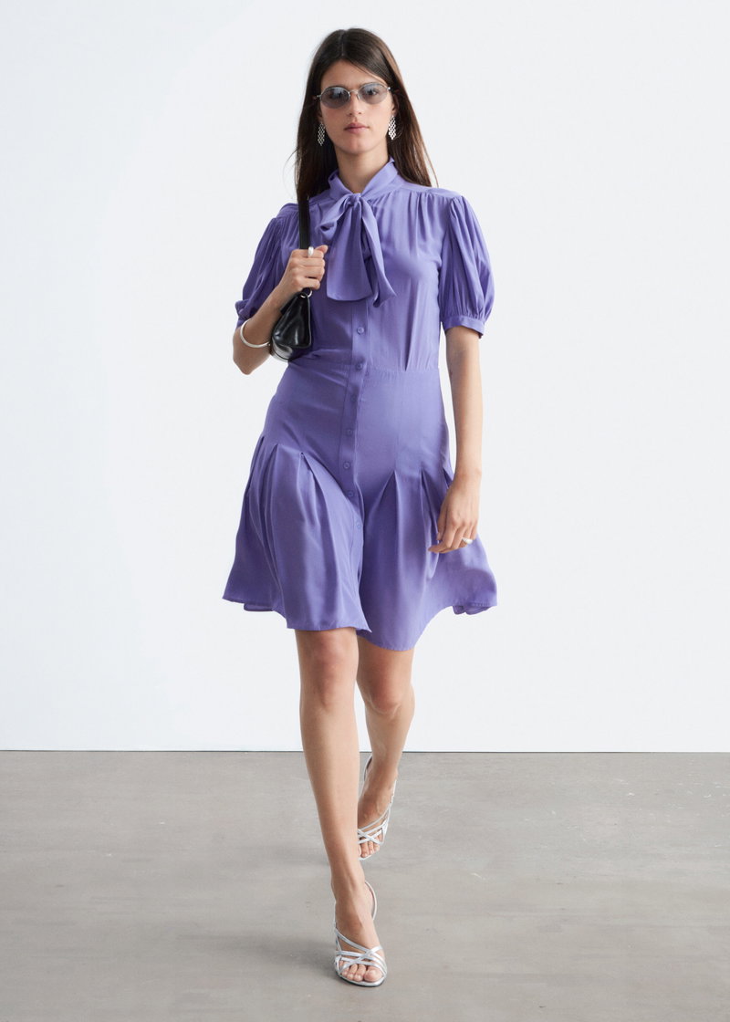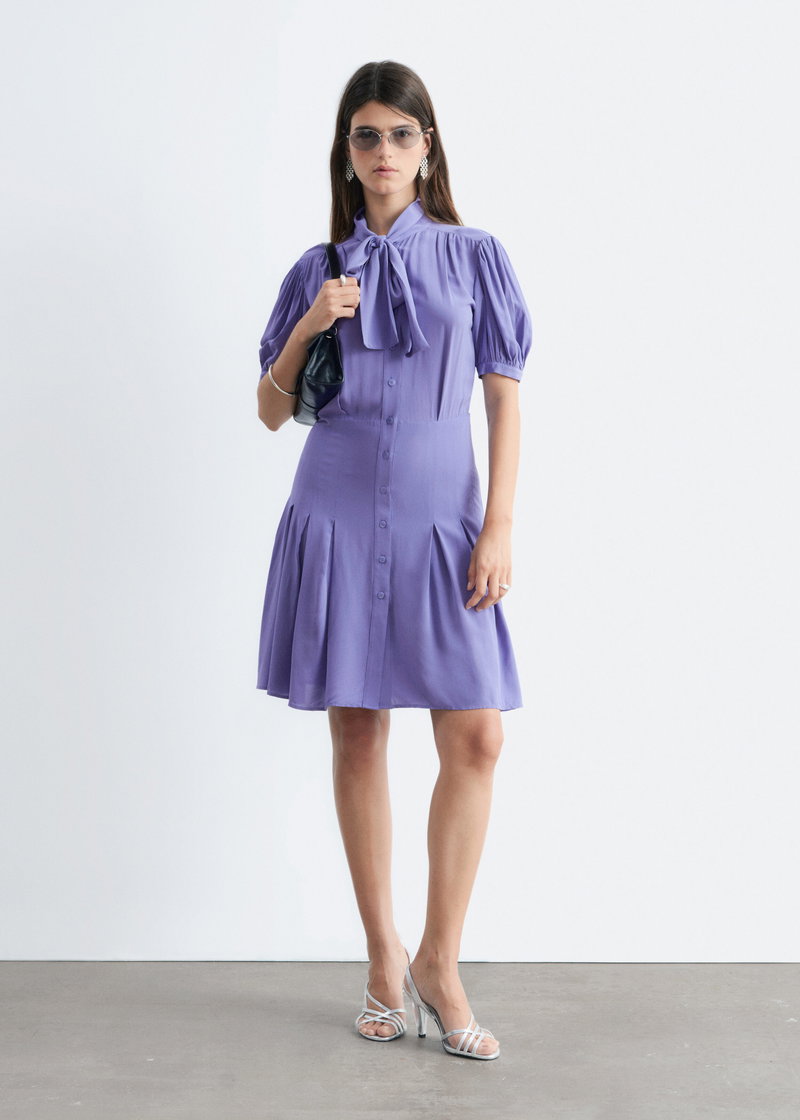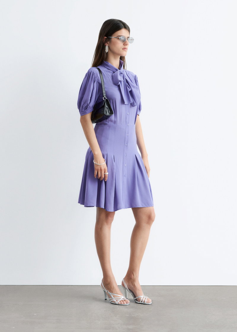 A modern take on preppy dressing. Mini dress with a bow neckline and short puff sleeves detailed with soft ruching. Finished with a button-through front and gently pleated skirt for subtle volume and movement.
