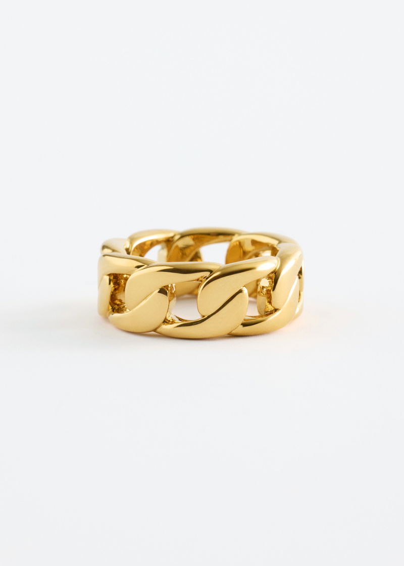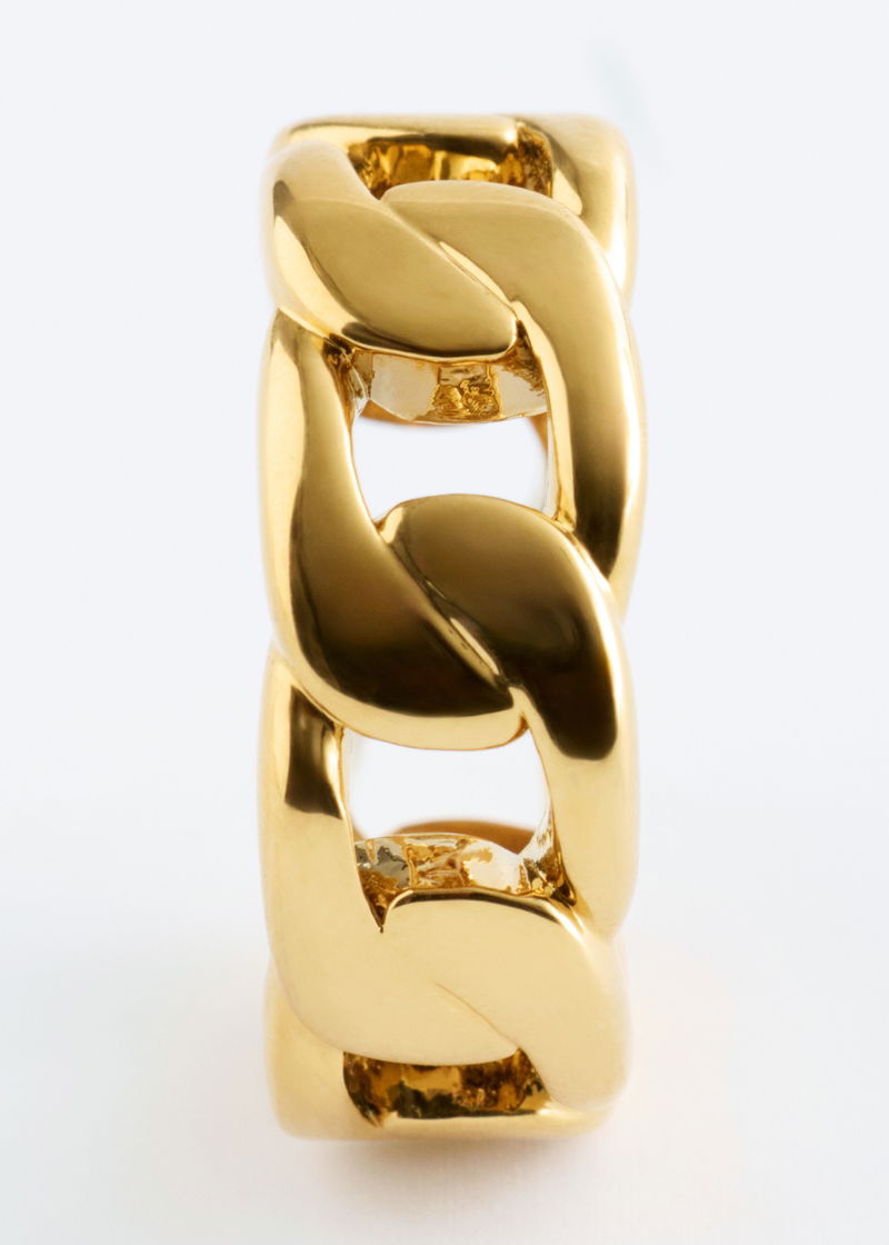 Crafted from polished brass, this chunky ring features interlinked chains, bringing a modern edge to everyday styling. Wear it solo or stacked with other pieces.