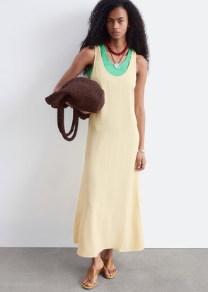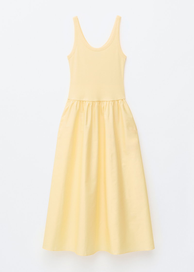 An easy choice for summer days, this tank dress is designed with a ribbed cotton-blend bodice that flows into a gathered A-line skirt, creating a long, fluid silhouette with soft movement.