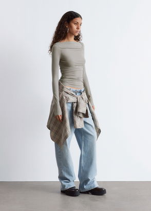 Draped jersey top with a knotted, asymmetric neckline. Designed with gathering on the waist and long sleeves.
