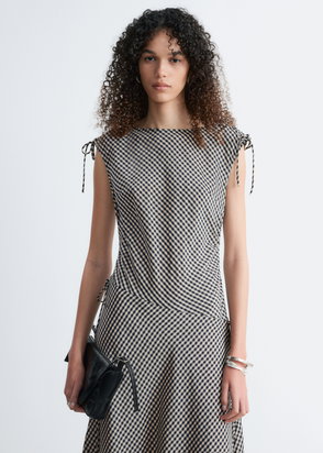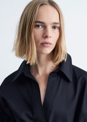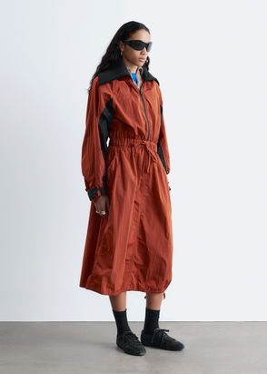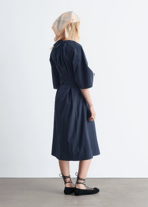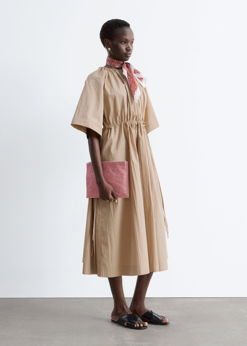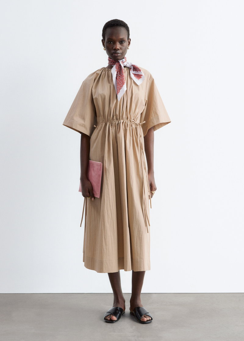 Cut from a soft cotton blend, this dress falls to a mid-calf length with a relaxed silhouette. The waist is defined by double drawstrings with self-fabric ties, creating subtle shape.