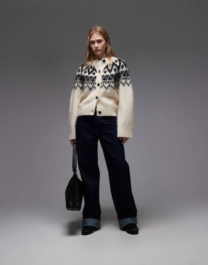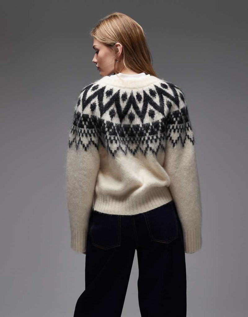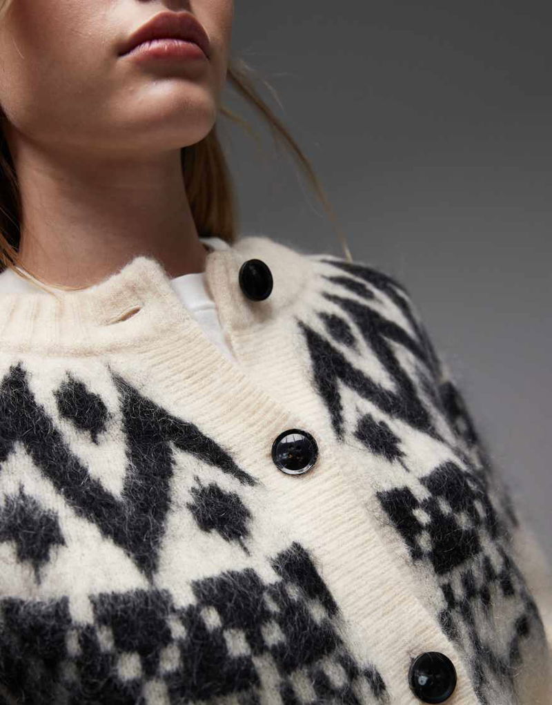Fluffy wool and mohair blend Fair Isle yarn jacquard print cardigan.