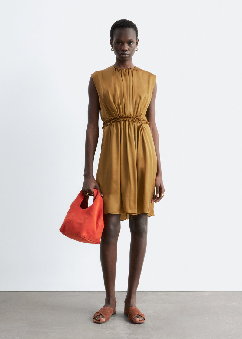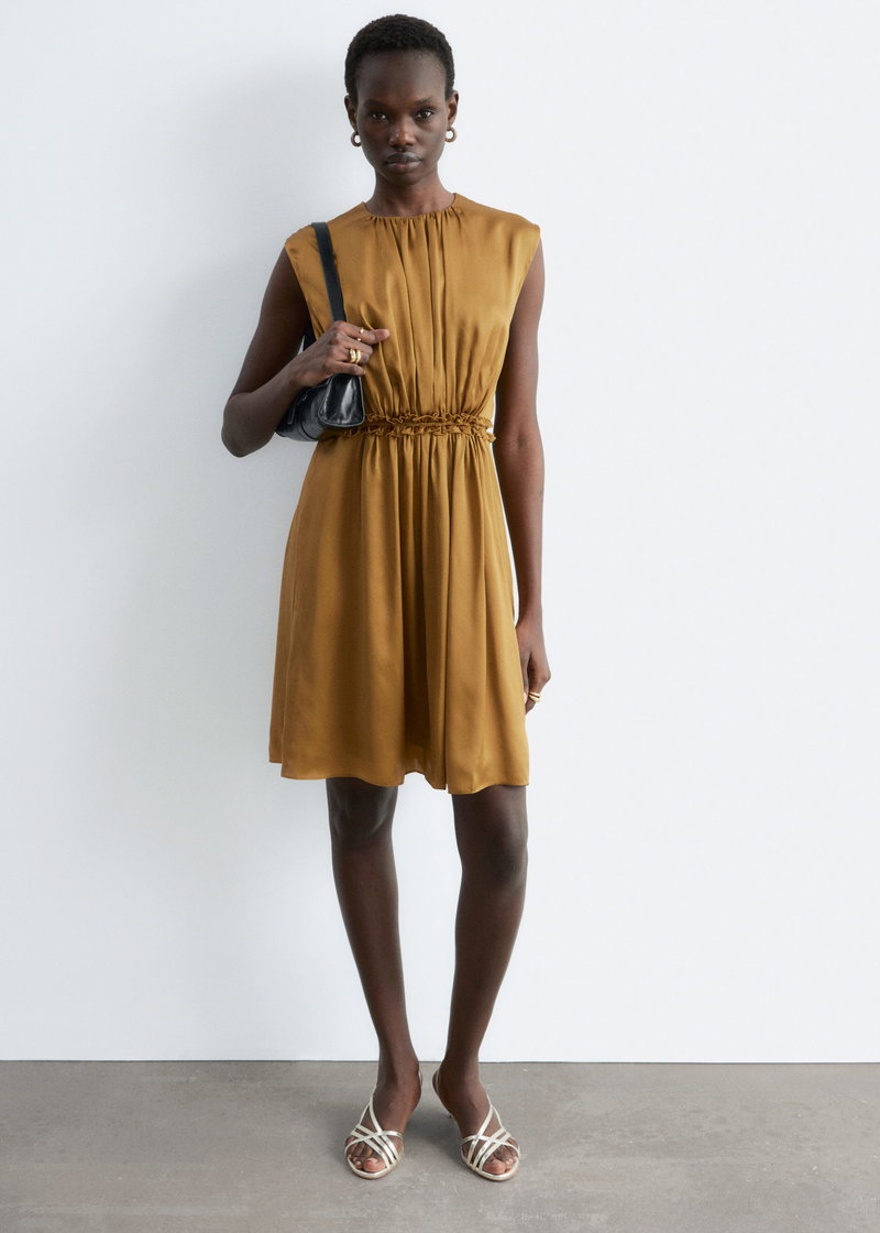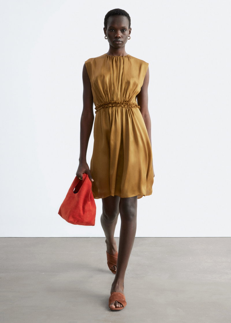 A soft note of romance, this sleeveless mini dress is crafted from pure mulberry silk with a luminous sheen. The silhouette is shaped by gentle gathers that create natural movement, while a ruched frill at the waist adds definition.