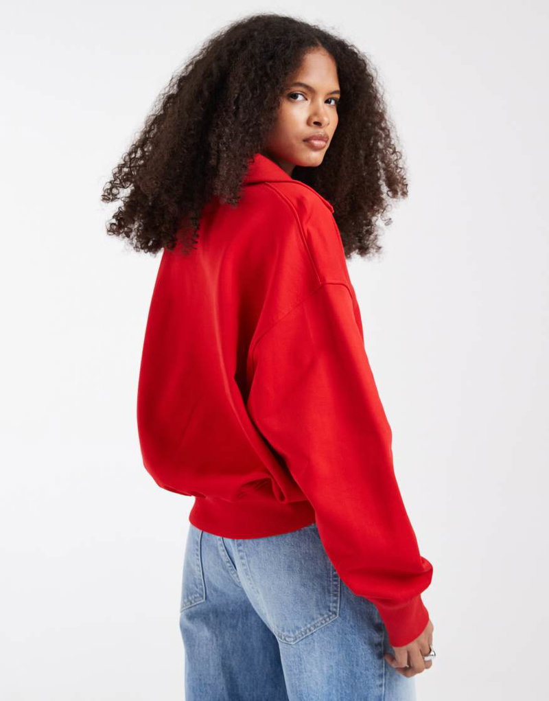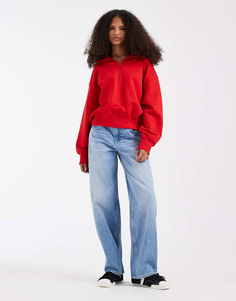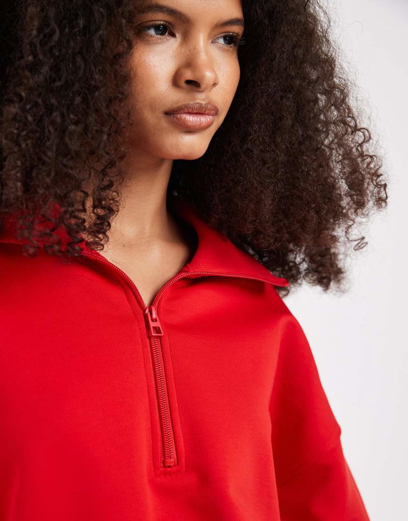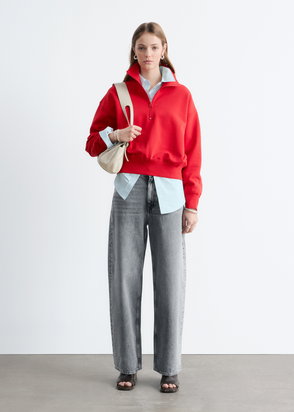 Half zip sweatshirt. Spread collar. Half zip. Elasticized cuffs and hem.