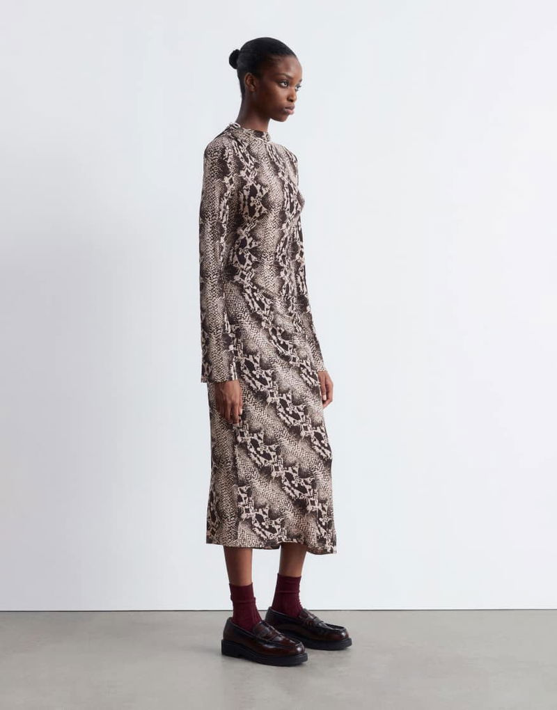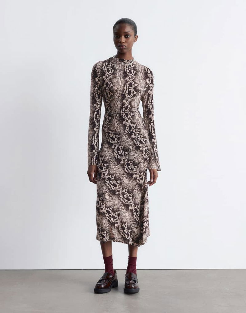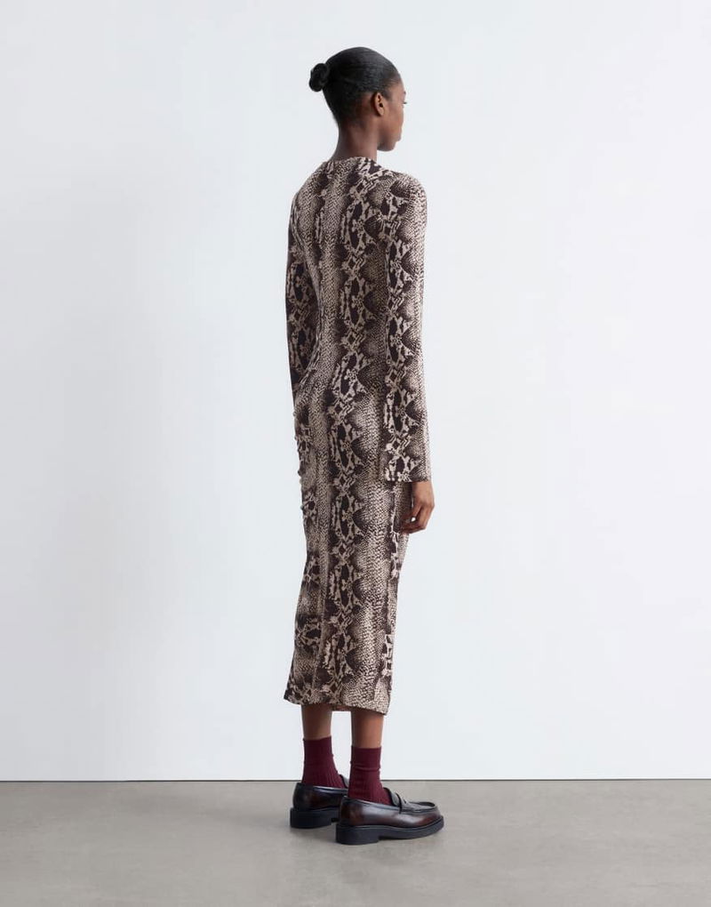 Jersey Long Sleeve Midaxi Dress With Side Ruche Detail In Brown Snake Print