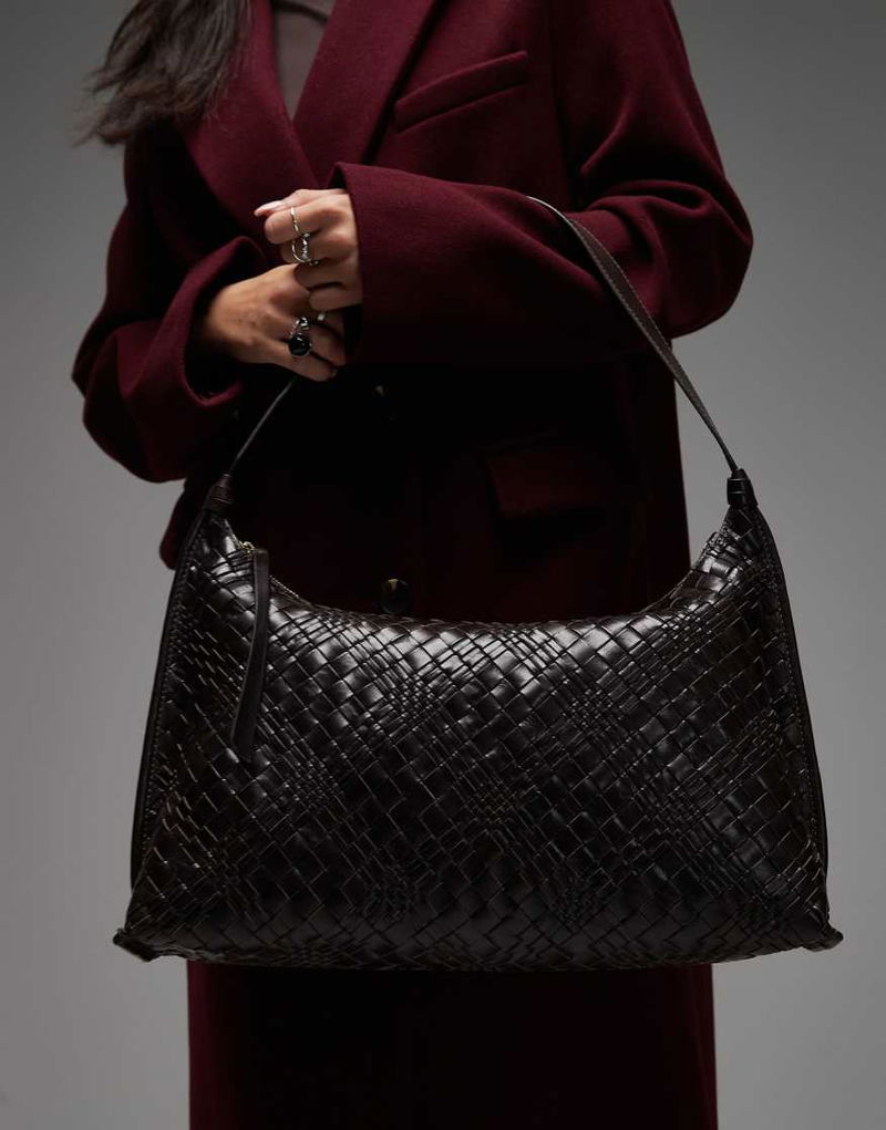 Large Leather Curved Braided Shoulder Bag With Fringing Trims In Brown