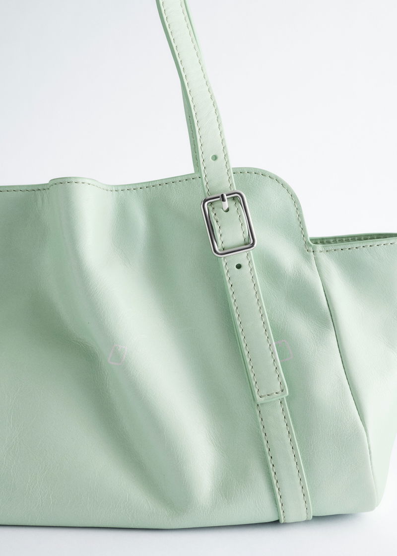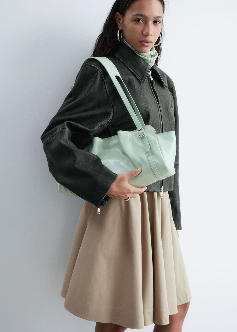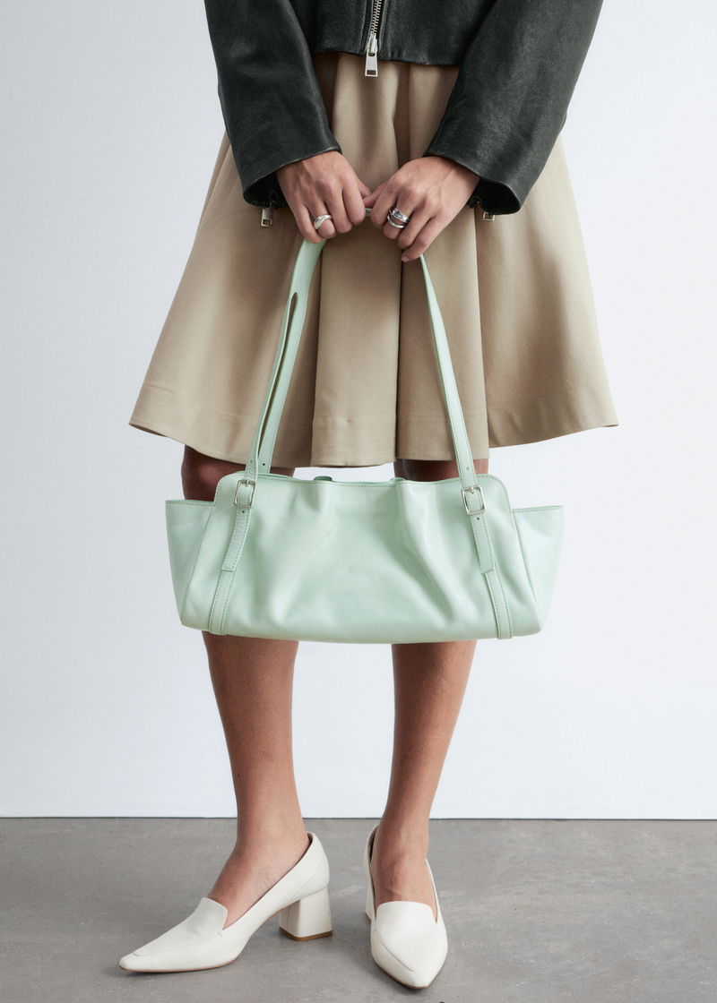 Crafted from supple leather, this shoulder bag is defined by a low-profile silhouette with a softly slouched lived-in feel. It features a cut-out shoulder strap with subtle buckle accents and a magnetic closure.