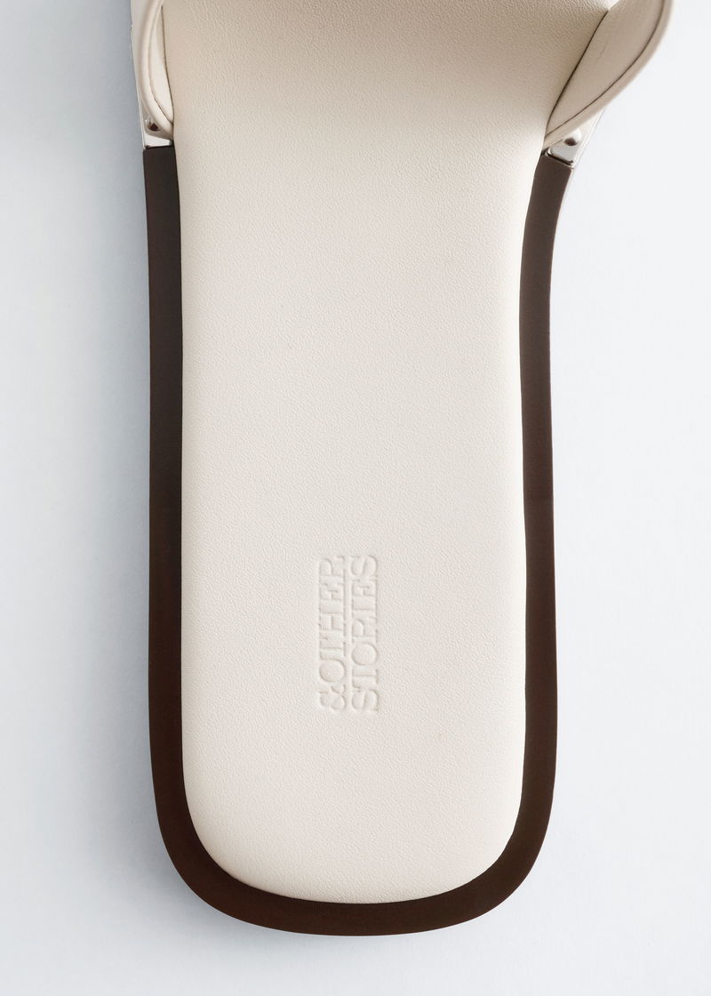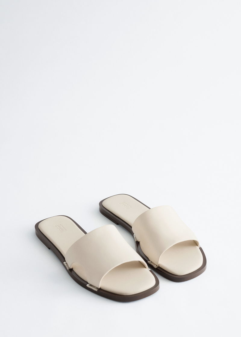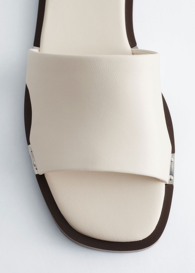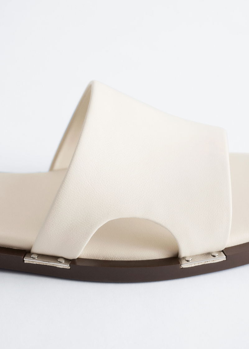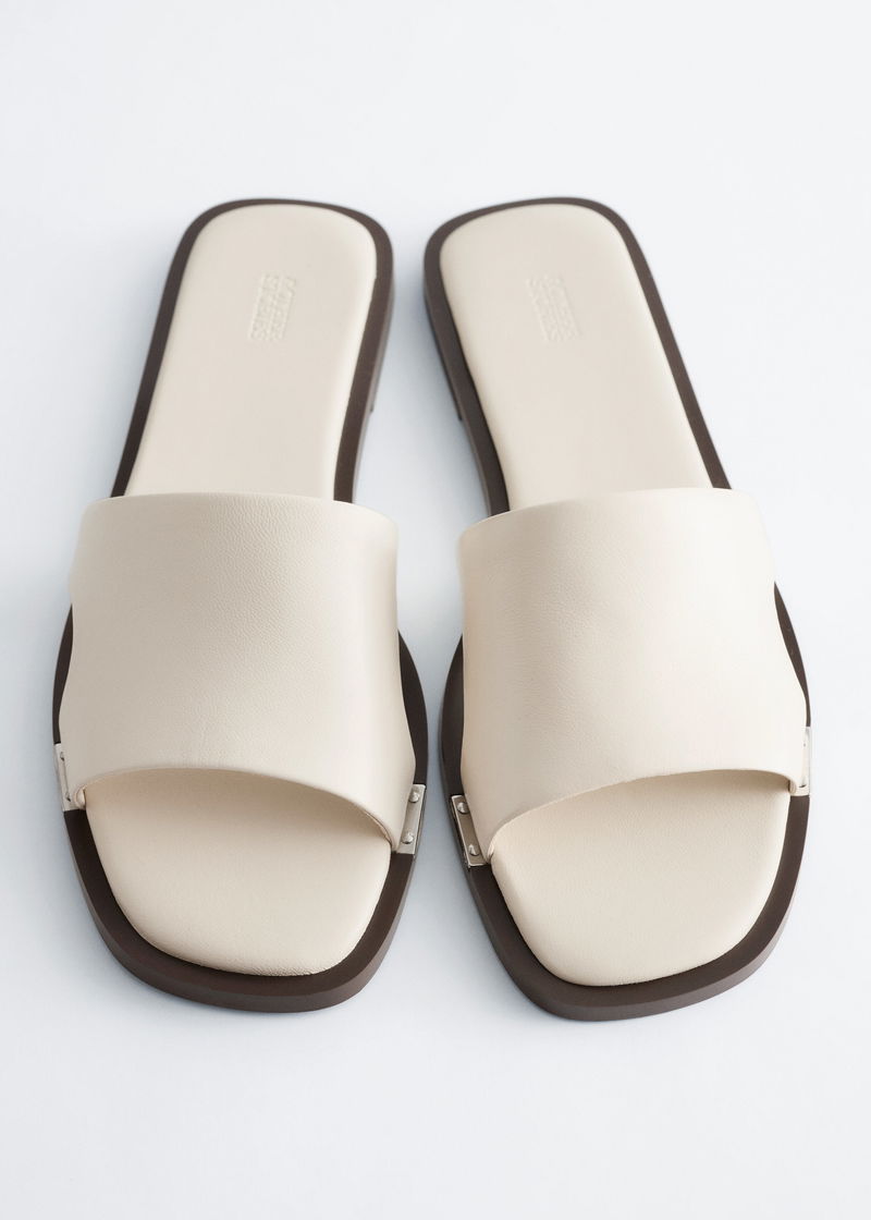 Crafted from supple sheep leather, these slides are distinguished by metal plates secured with studs along the sides. A square‑toed silhouette offers step‑in ease and a stable fit.