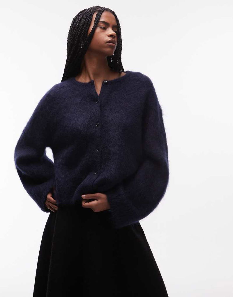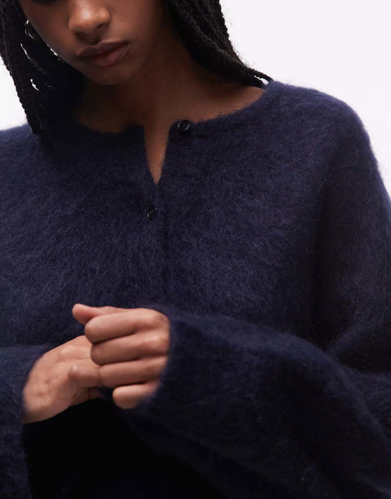 Mohair And Wool Blend Crew Neck Cardigan In Navy