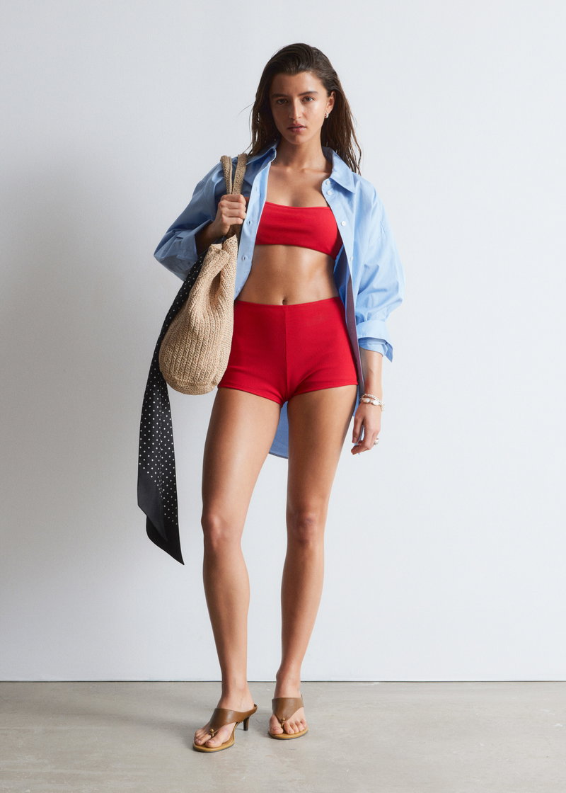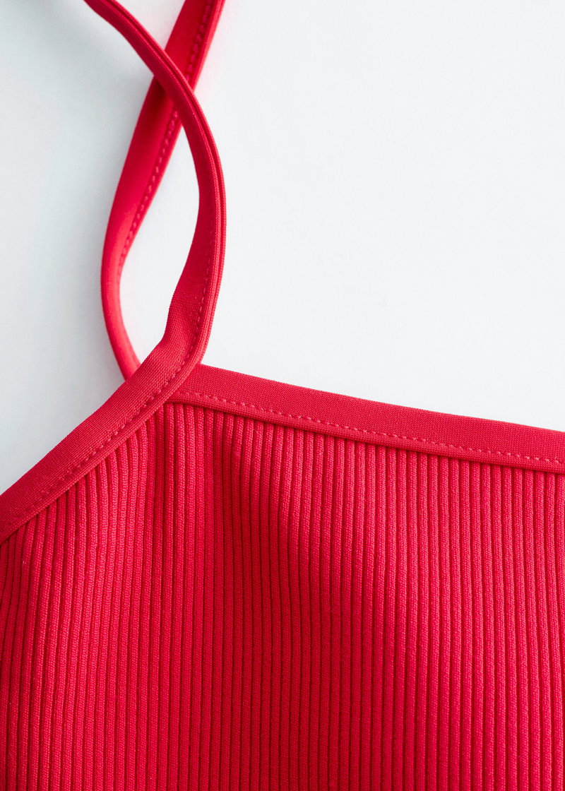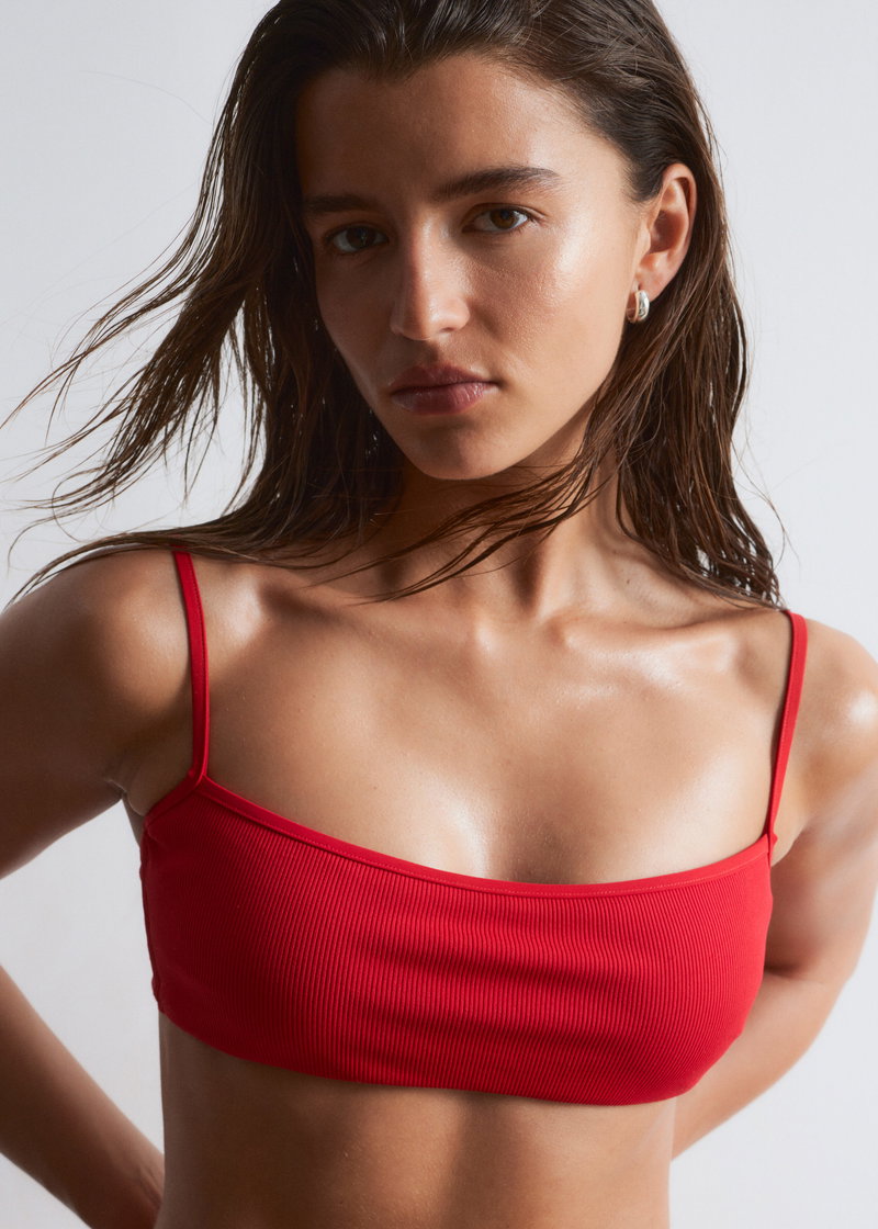 Crafted in a fine rib, this bandeau bikini top features a clean straight neckline and slim, adjustable straps for a personalised fit. Unpadded and wireless for a natural feel, it is finished with a clasp closure at the centre back.