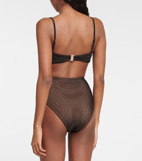 Bikini top crafted in a lustrous tricot fabric. Designed with decorative ruching, and thin adjustable straps that can be removed for an optional bandeau look. Finished with light padding, and an adjustable hook closure at the back.
