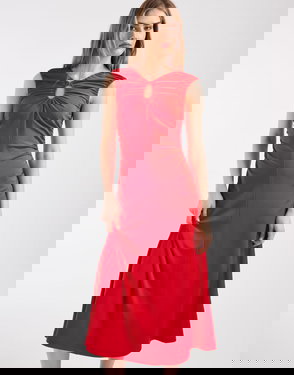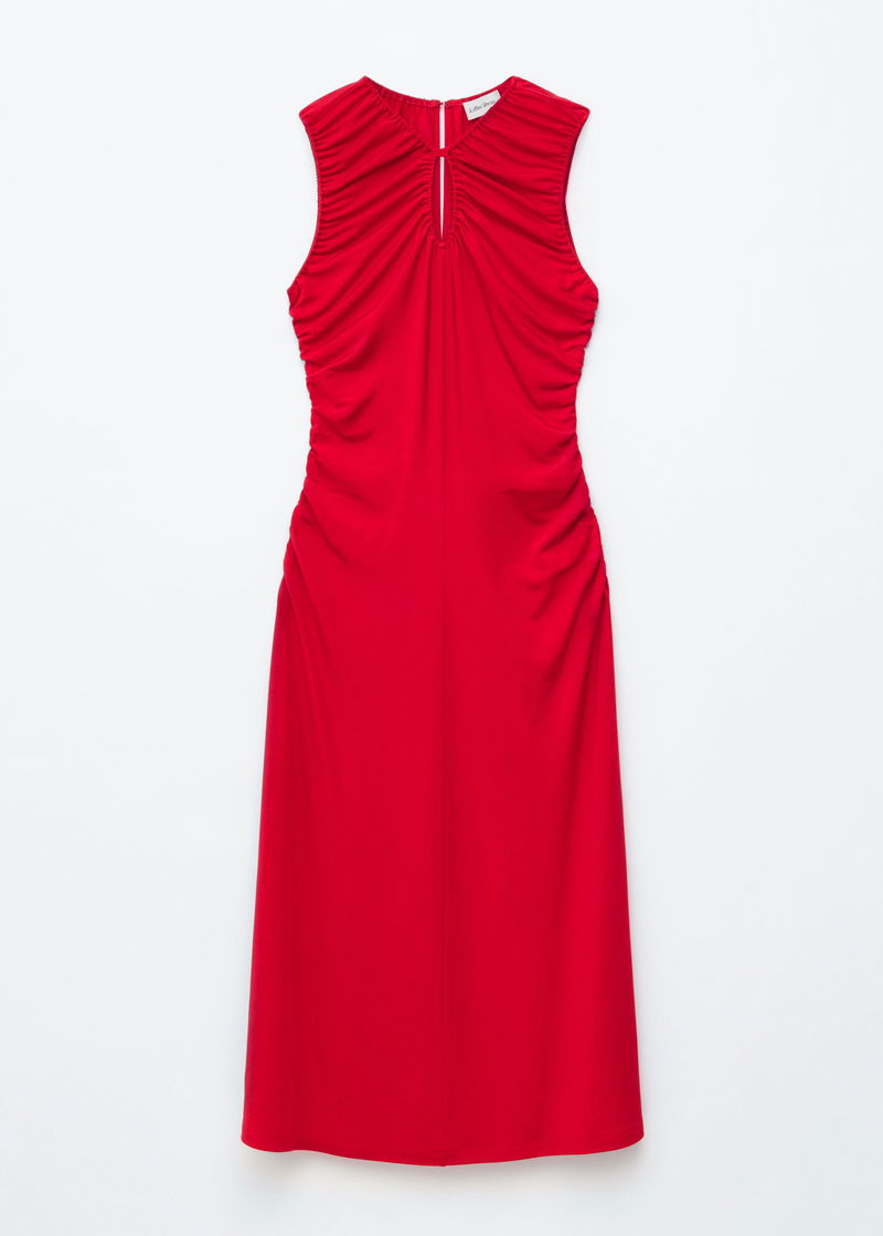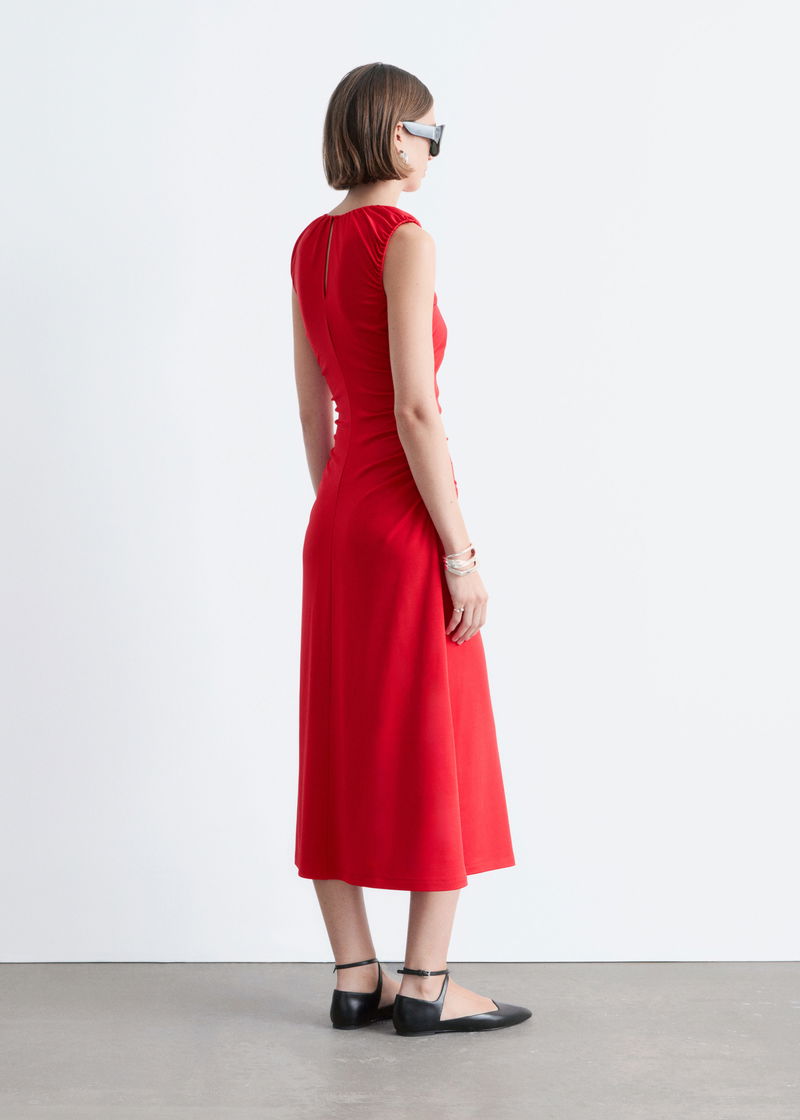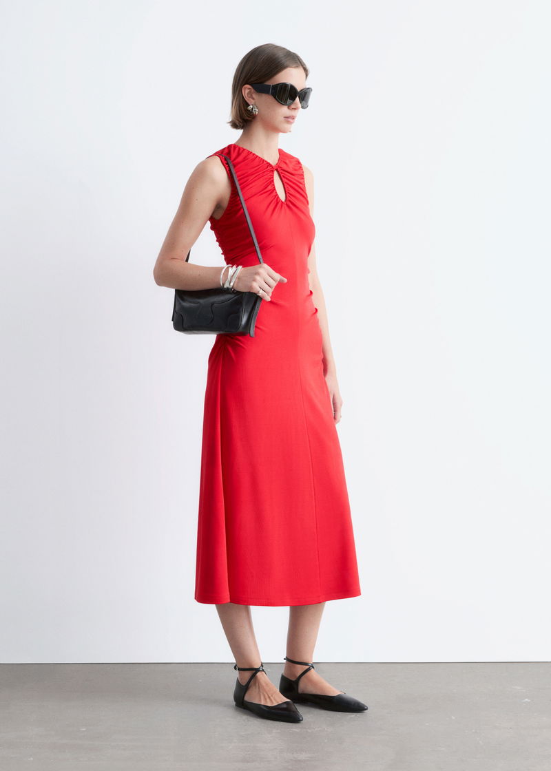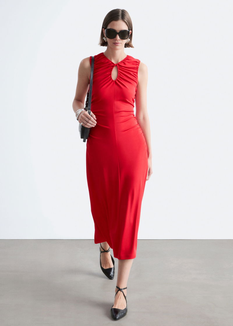 Ruched Keyhole-Neck Midi Dress