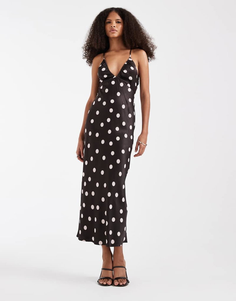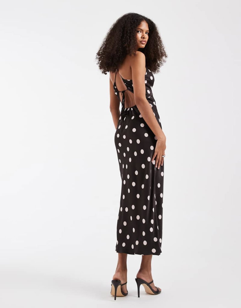 Strappy Midi Dress With Cut Out Back Detail In Brown Polka Dot