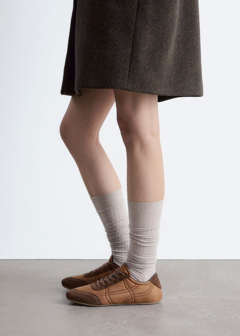 These lightly padded trainers are crafted in Portugal from suede and fabric, featuring decorative side stitching and tone-on-tone laces.