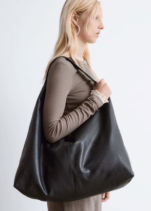 This spacious tote bag is crafted from soft suede, featuring side gusset panels with a contrasting leather strap for an interesting play of texture. Designed for versatility, it features two pairs of handles in varying lengths, allowing you to carry it in different ways. The bag is finished with delicate ties to secure the opening and includes an inner pocket for storing smaller belongings.