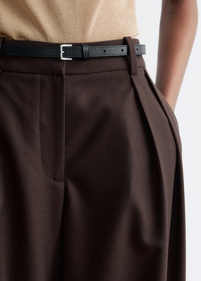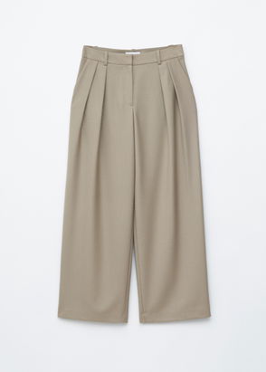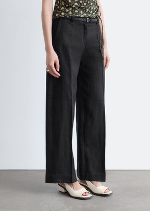 Tailored linen trousers featuring a regular waist, a straight silhouette and press creases. Size up for a relaxed, slouchy fit. Belt loops. Zip fly with hook and bar closure. Slanted side pockets. Welt pockets at the back.