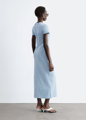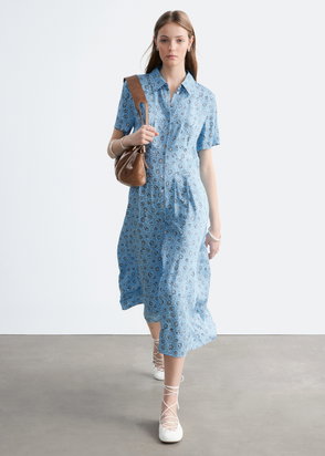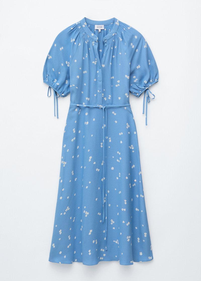 Midi dress in soft satin with a fluid, lightweight silhouette. Rounded puff sleeves are detailed with gentle ruching and delicate tie closures at the cuffs. A slim tie-closure at the waist allows for subtle shaping, balanced by a half button placket for a clean, understated finish. Cut to a midi length, designed for easy summer dressing.