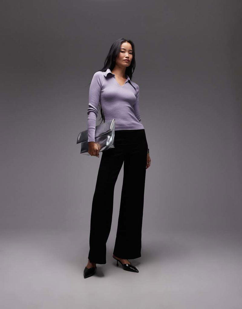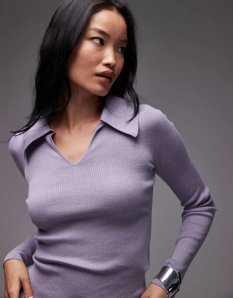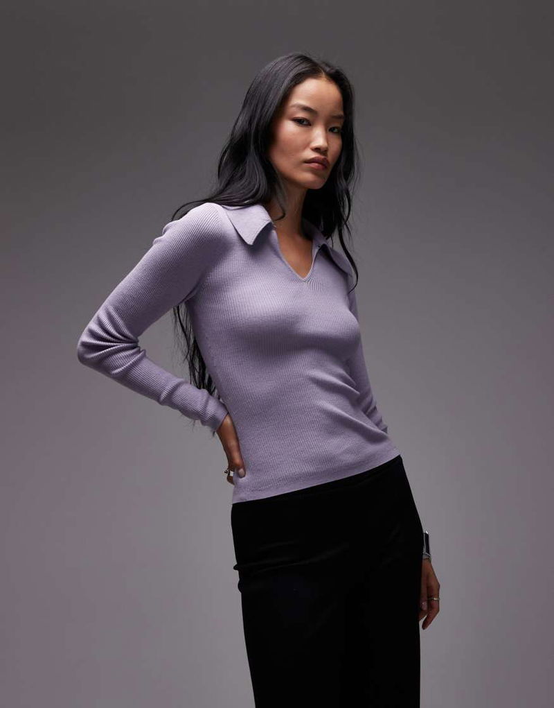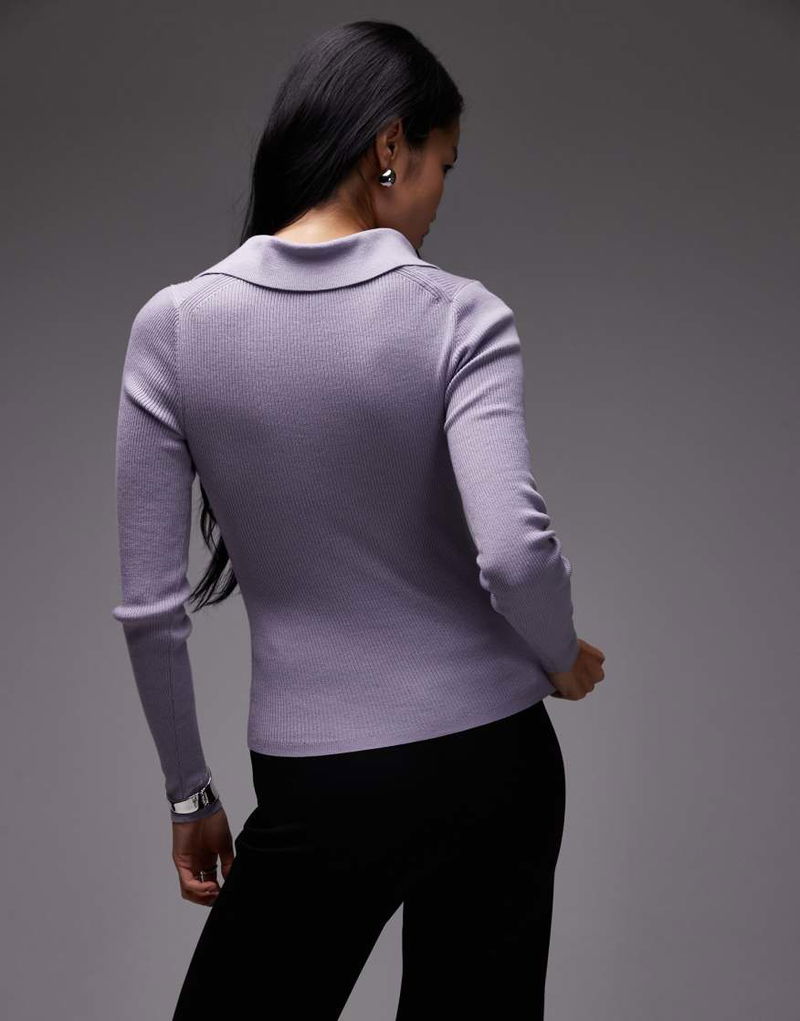 Wool Blend Knitted Top In Lilac With Contrast Keyhole Collar