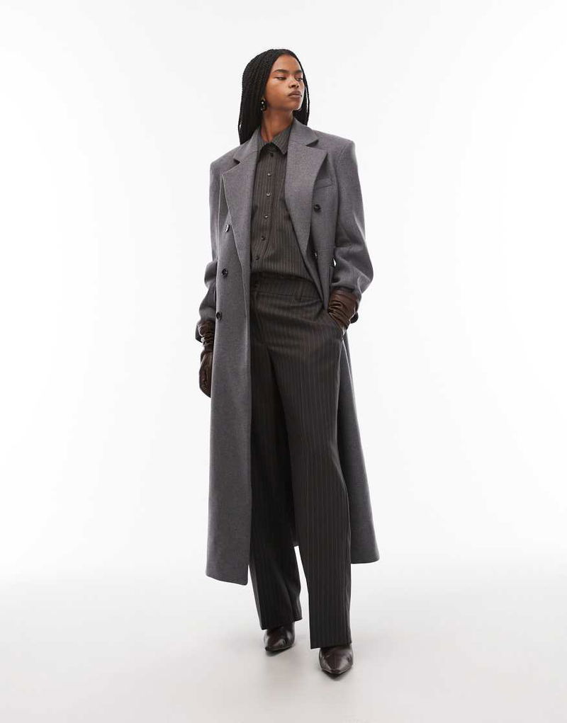 Wool Double Breasted Maxi Coat With Bold Shoulder Details In Grey